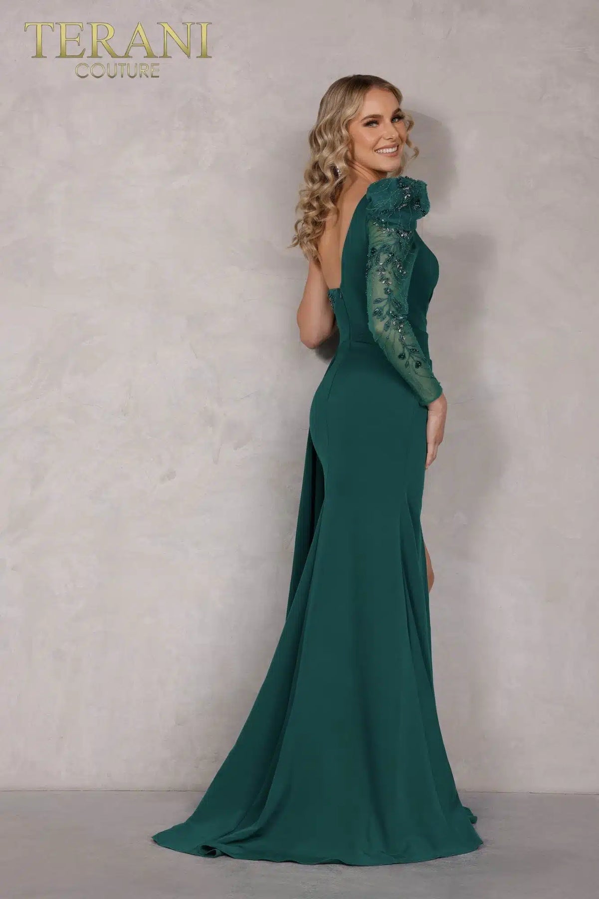 Make a statement in this stunning Red Mermaid Evening Dress from Terani Couture's Fall 2022 collection. The asymmetrical single long sleeve and sweetheart neckline create an elegant silhouette, while the dramatic side train and thigh-high slit add undeniable allure. Crafted from luxurious 2-way stretch satin for comfort and movement, this show-stopping gown ensures you'll command the room. Available in rich jewel tones including emerald and blush, find your perfect shade and size online today at unbeatable prices.