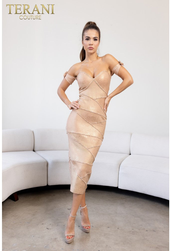 Shine brightly in the TERANI 241C2318 dress, featuring an elegant off-shoulder neckline that beautifully highlights your shoulders and décolletage. Crafted from shimmering metallic jacquard rose fabric, this bodycon column gown captures the light with every move. Designed to flatter all sizes, it offers a timeless silhouette that enhances your figure while exuding sophistication. Perfect for special events, this dress helps you step confidently into the spotlight and leave a memorable impression.