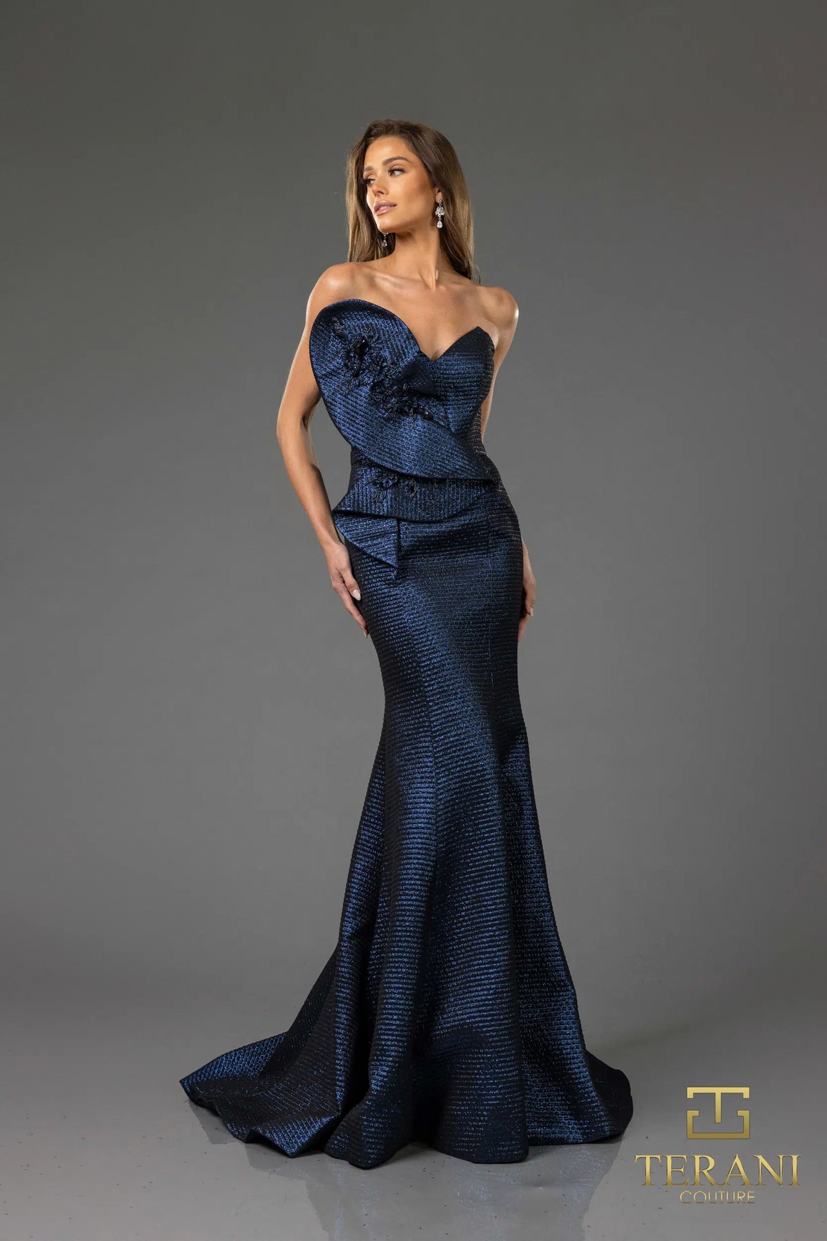 Radiate timeless charm with our style TERANI 251E4276 DRESS , a breathtaking trumpet evening gown crafted from metallic jacquard available in elegant hues of champagne, navy, amber, and rose gold. The sweetheart neckline and sleeveless design enhance the gown’s classic allure, while the fitted trumpet silhouette beautifully contours the body for a stunning, sophisticated look. With a secure hook-and-eye and zipper closure at the back, it offers both comfort and confidence, making it an ideal choice for formal gatherings, galas, or special celebrations. The luxurious jacquard fabric adds a luminous touch, blending sophistication with radiance, ensuring a memorable entrance at any event.
