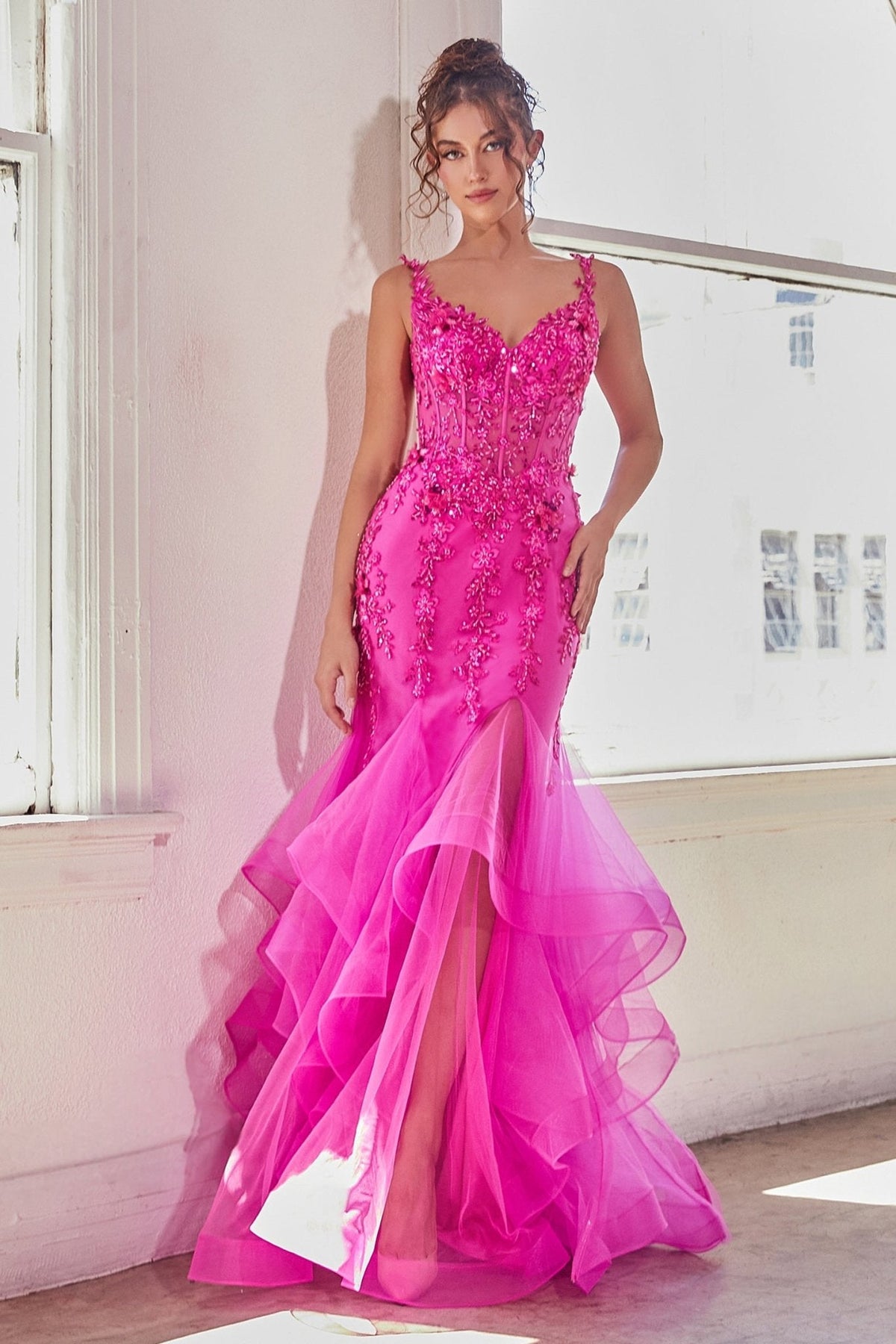 Make a statement in our mesmerizing mermaid gown tailored for the young and fabulous. The structured fitted bodice is a work of art, adorned with whimsical embellished lace appliqué that adds a touch of romance to your look. Appliquéd straps delicately frame your shoulders, striking the perfect balance between elegance and modern flair. The full-layered trumpet skirt cascades gracefully, creating a dramatic silhouette that's both chic and playful. Dance the night away with confidence, as a tasteful leg slit adds a touch of flirtation to this show-stopping ensemble. This gown is more than a dress; it's a celebration of your youthful spirit and vibrant charm. Embrace the spotlight and let your confidence shine in this stunning creation that's as unique and fabulous as you are.