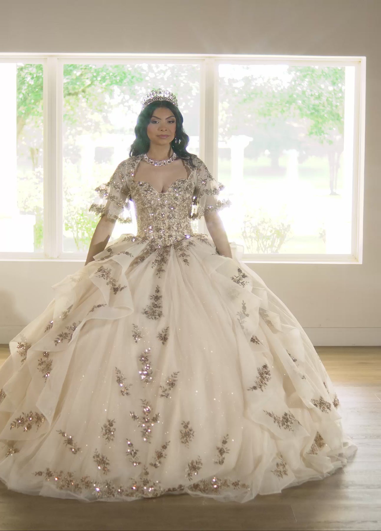 Discover enchantment with the Rachel Allan RQ1138 dress, perfect for a fairytale moment. Twirl in layers of glittering tulle and switch up your look with the detachable jacket. The strapless corset bodice shapes a romantic silhouette, while the lace-up back guarantees the perfect fit. Subtle appliques and shimmering beads sprinkle just the right amount of sparkle for a magical touch she'll adore.