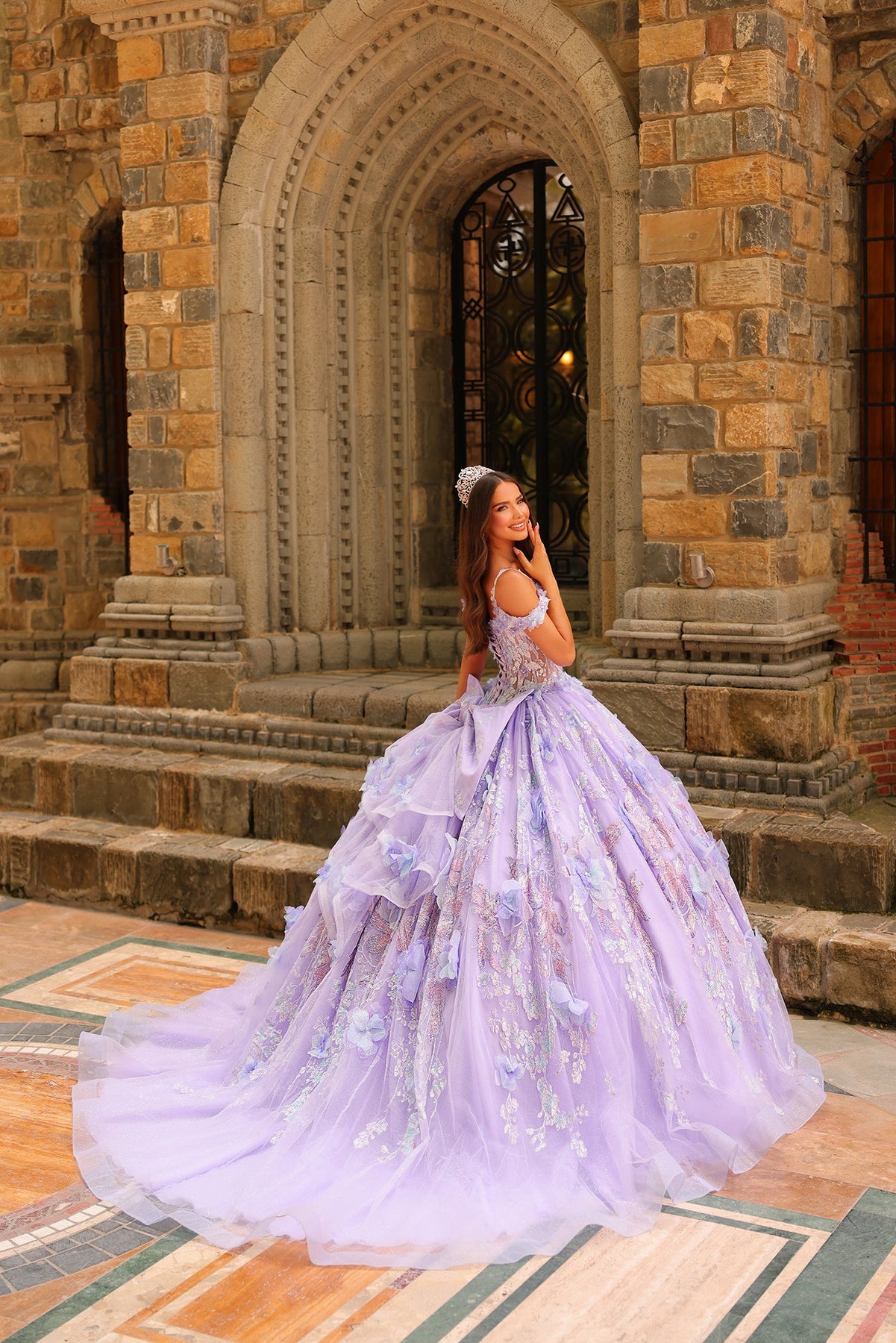 Feel like a fairy tale come to life in the Amarra 54232 Dress. This playful quinceañera gown features a sheer corset bodice adorned with sparkling stones and delicate 3D floral appliqués that cascade beautifully onto a voluminous glitter tulle skirt. The sweetheart neckline and detachable off-the-shoulder straps add a charming touch, while the lace-up back ensures a perfect fit. With layers that float like clouds, this magical dress promises to make your special day truly unforgettable.