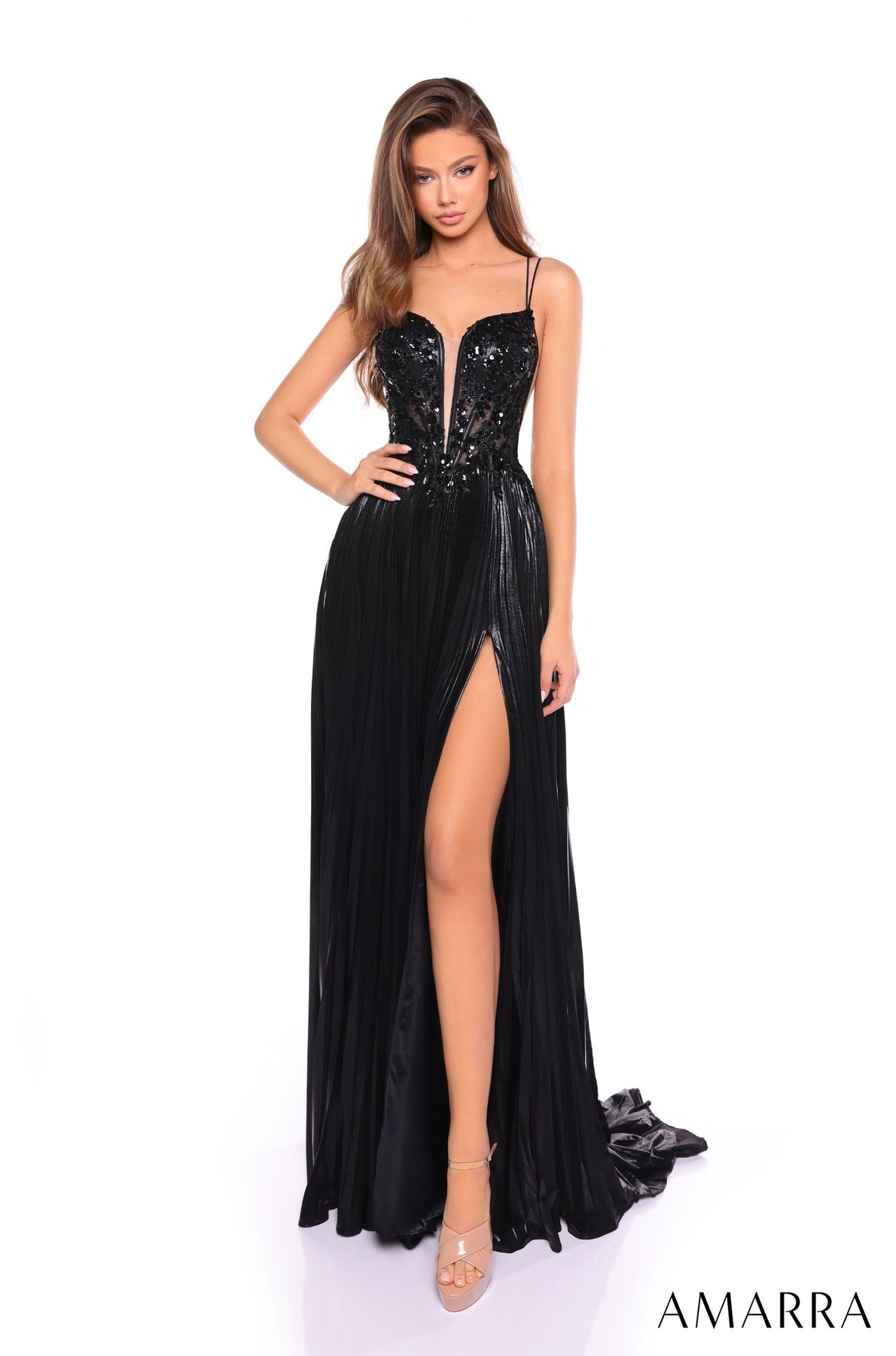 هذا الفستان الآسر ذو قصة A يتميز بتنورة فاخرة مطوية من قماش الشارموز تنساب بأناقة على الأرض، مع شق عالٍ جريء لإضفاء لمسة من الإثارة. يكتمل التصميم بدون أكمام بفتحة رقبة عميقة، بينما يُضفي الجزء العلوي المزين بالترتر لمسة من التألق والرقي. تُضفي الألواح الجانبية الشفافة لمسة من الجاذبية، بينما يضمن الظهر المُربط تصميمًا مثاليًا ومُلائمًا للجسم. مثالي لأي مناسبة رسمية، يجمع هذا الفستان بين الأناقة الكلاسيكية والتفاصيل العصرية، مما يجعله خيارًا مميزًا لقضاء أمسية ساحرة.