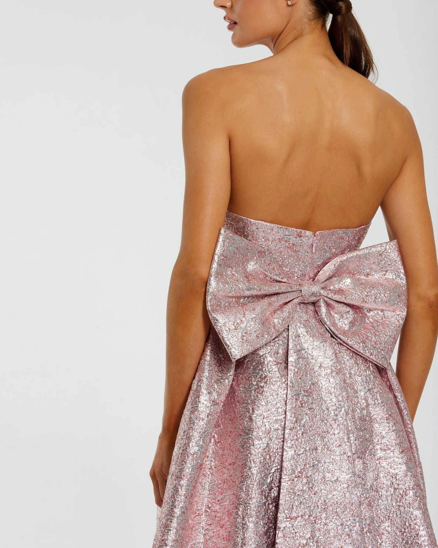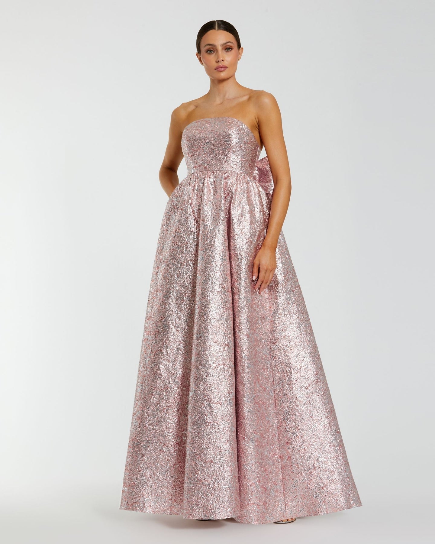 يتميز هذا الفستان بدون حمالات بقوس كبير الحجم في الخلف وقماش بروكار معدني فاخر وجيوب مخفية، مما يجعله خيارًا مثاليًا لأي مناسبة أنيقة.