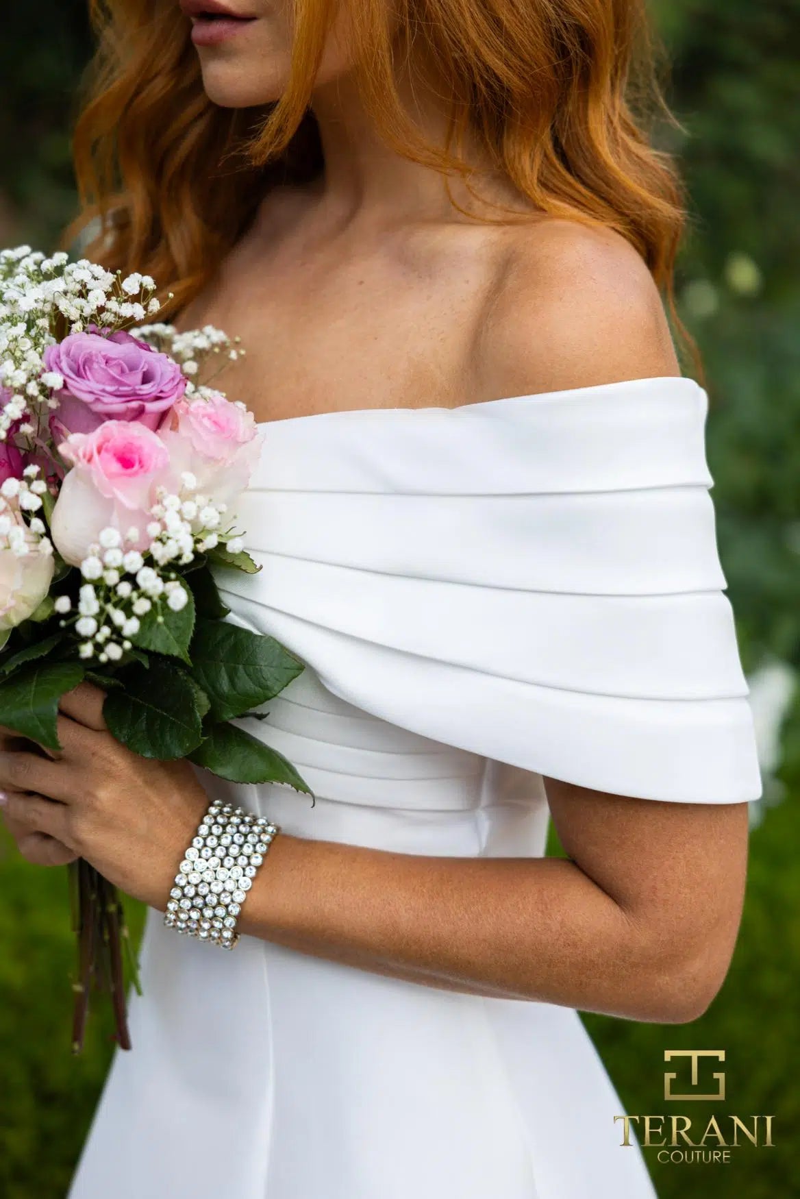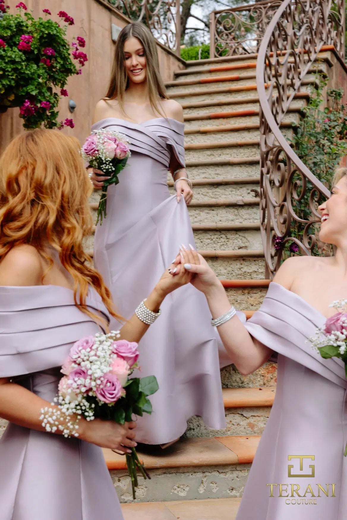 من المؤكد أنك ستخطفين الأنظار في أي مناسبة اجتماعية عندما ترتدين هذا الفستان المكشوف الكتفين من تصميم Terani Couture.