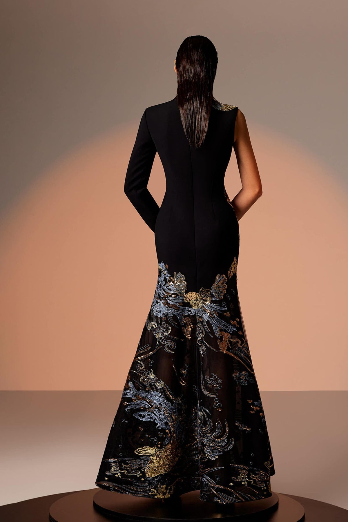 👗 تفاصيل جميلة: الأكمام الطويلة الملائمة والرقبة المغلقة تخلق صورة ظلية أنيقة، في حين يضيف التصميم الفريد ذو الأكمام الواحدة لمسة من الدراما.