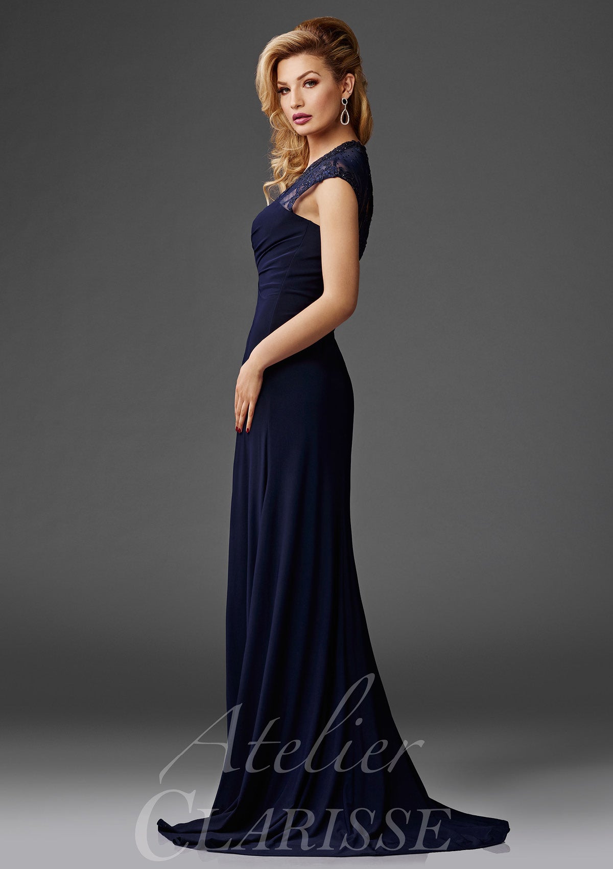فستان طويل من قماش الجيرسي مع خصر إمبراطوري وأكمام من الدانتيل وفتحة رقبة على شكل حرف V ومزين بالخرز.