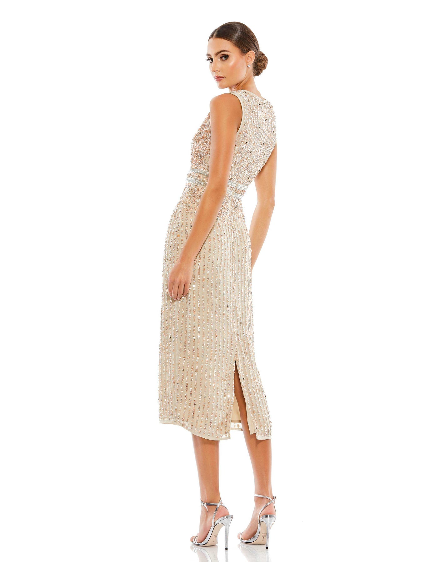 رائع فستان متوسط الطول بدون أكمام مزين بالترتر العمودي مع خصر مزين يدويًا وشق خلفي.