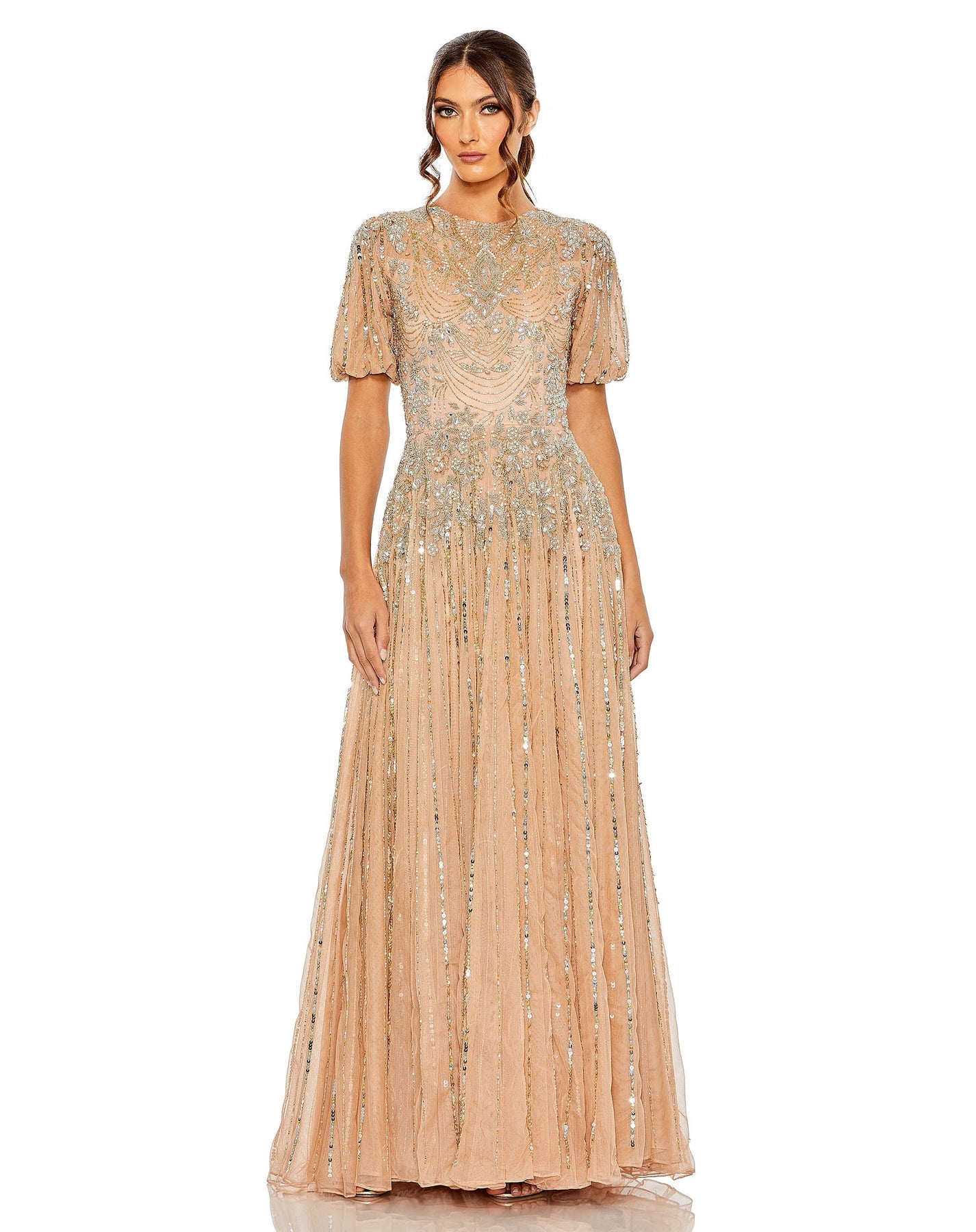 تألقي بأناقة خالدة مع هذا الفستان ذي الياقة العالية والأكمام المنفوخة. زخارفه الباهرة وتصميمه الأنيق على شكل حرف A يجعلانه مثاليًا لأي مناسبة رسمية أو مسائية.