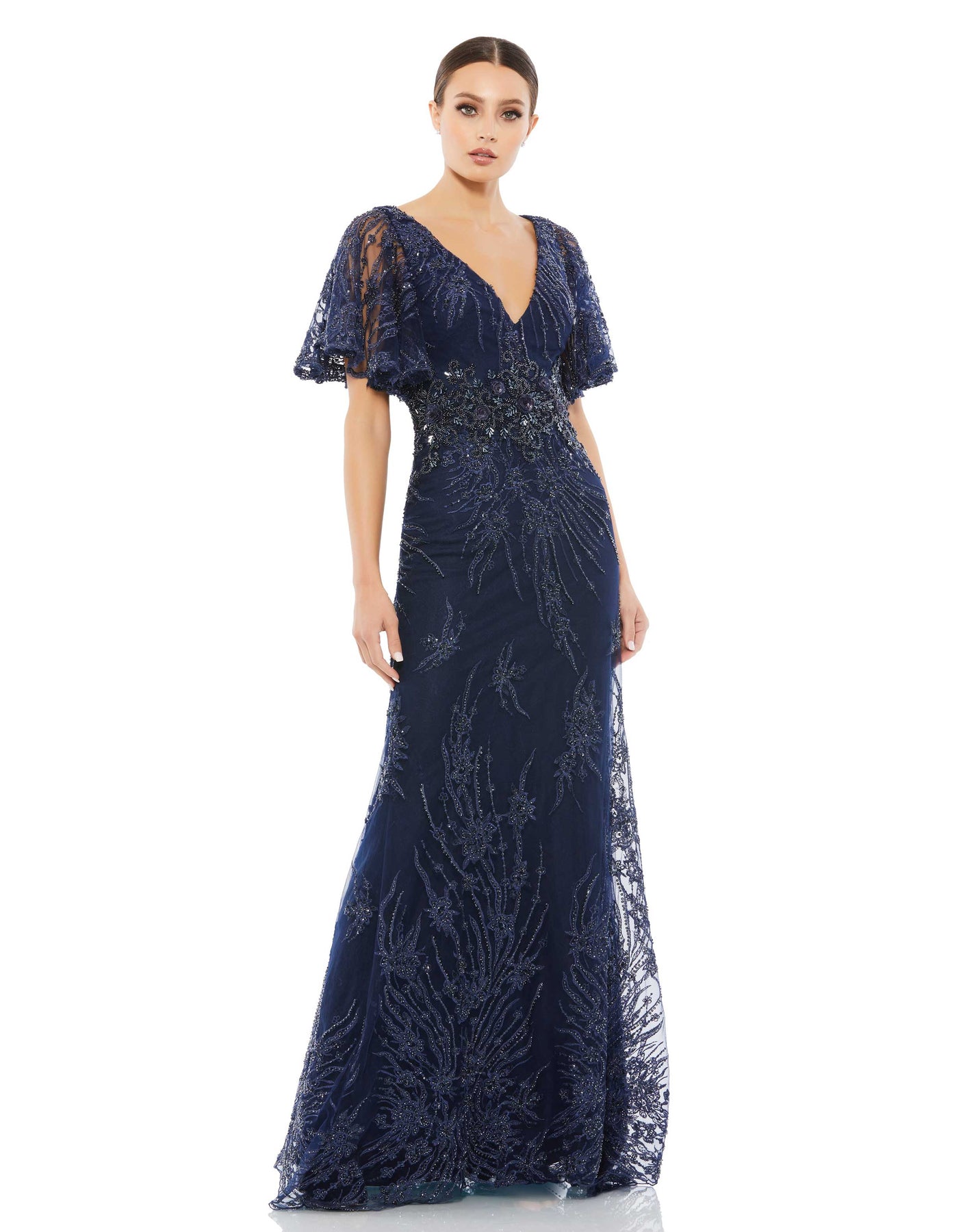 فستان سهرة مزين بشكل رقيق ومغطى بخرز لامع مع ذيل قصير وأكمام فراشة.