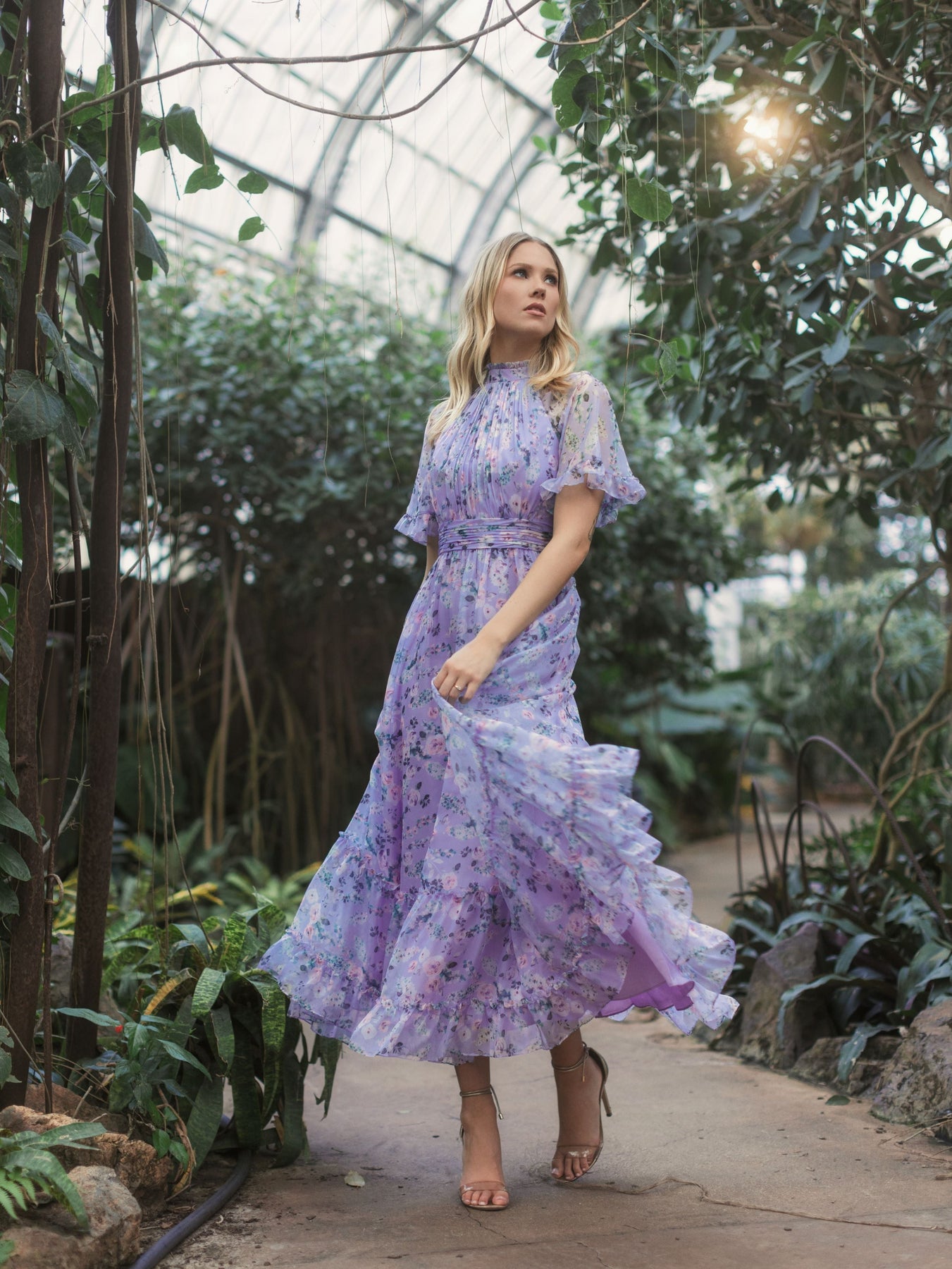 فستان بطبعة زهور برقبة عالية وأكمام راجلان