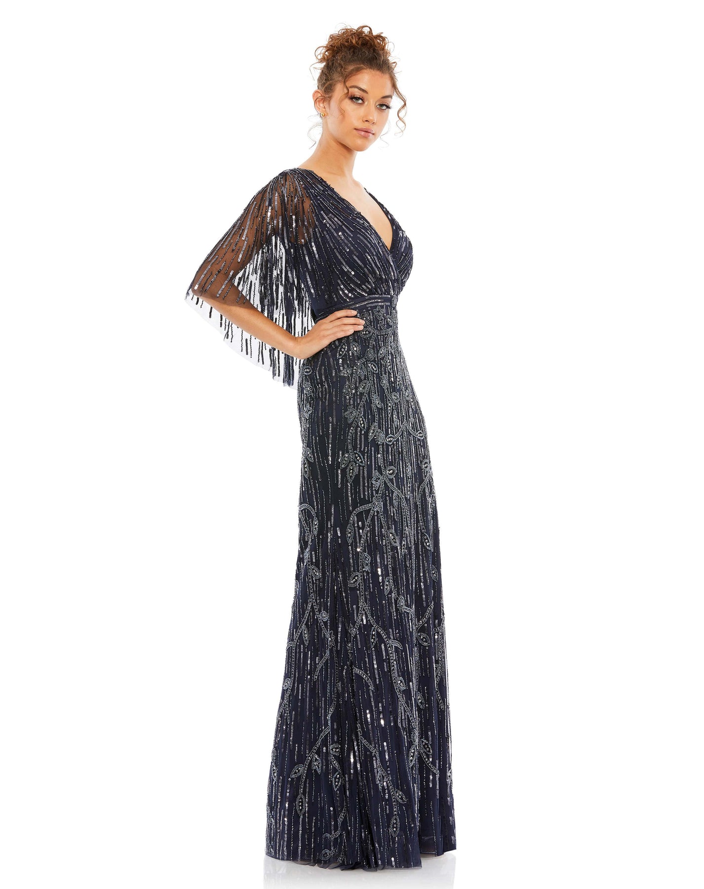 فستان سهرة أنيق بفتحة رقبة على شكل حرف V، مزين بتطريزات زهرية من الترتر والخرز على كامل القماش الشبكي. أكمامه الشفافة المنسدلة وظهره على شكل عباءة مزين بصفوف من الترتر.