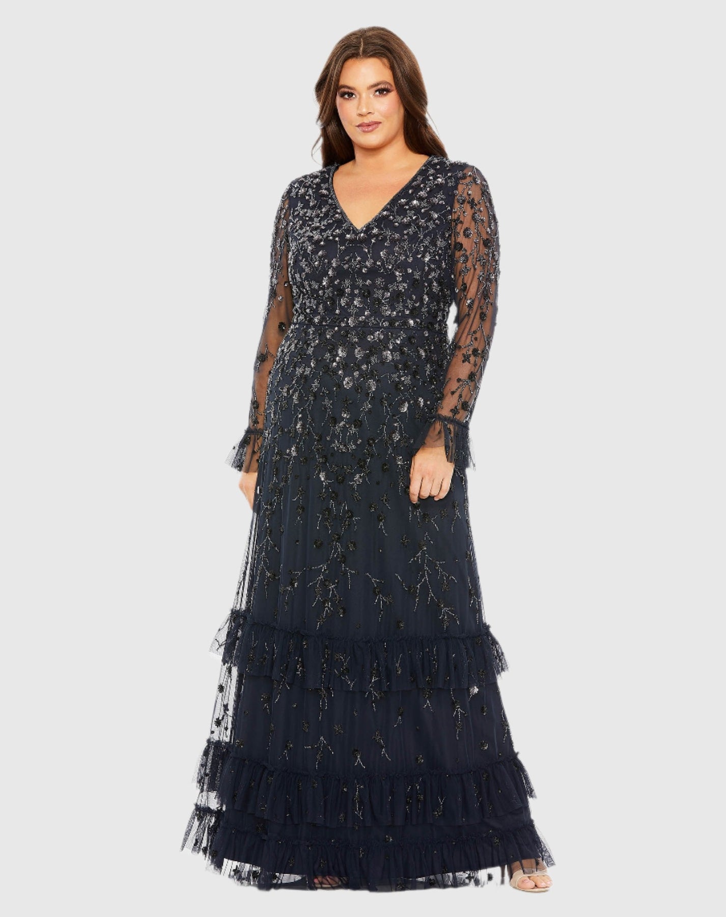 تألقي بإطلالتك مع فستان ماك دوغال 9271. يتميز هذا الفستان بفتحة رقبة على شكل حرف V وتطريزات خلابة وأكمام واسعة، مثالي للمناسبات الأنيقة. يضفي قماشه الشبكي المزين بالخرز لمسة من الأناقة، بينما تضفي الحافة المتدرجة المزينة بالكشكشة والنقشة الرقيقة بالترتر لمسة مرحة. متوفر بلون منتصف الليل.