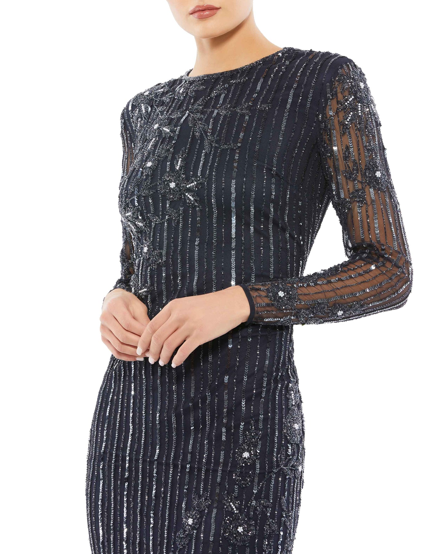 • صفوف عمودية من الترتر المطرز يدويًا مع تطريزات زهرية معقدة