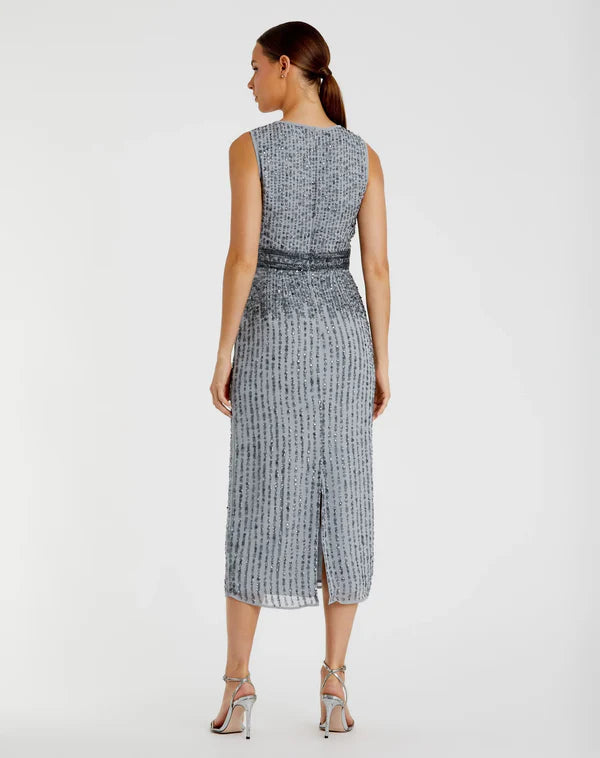 رائع فستان متوسط الطول بدون أكمام مزين بالترتر العمودي مع خصر مزين يدويًا وشق خلفي.
