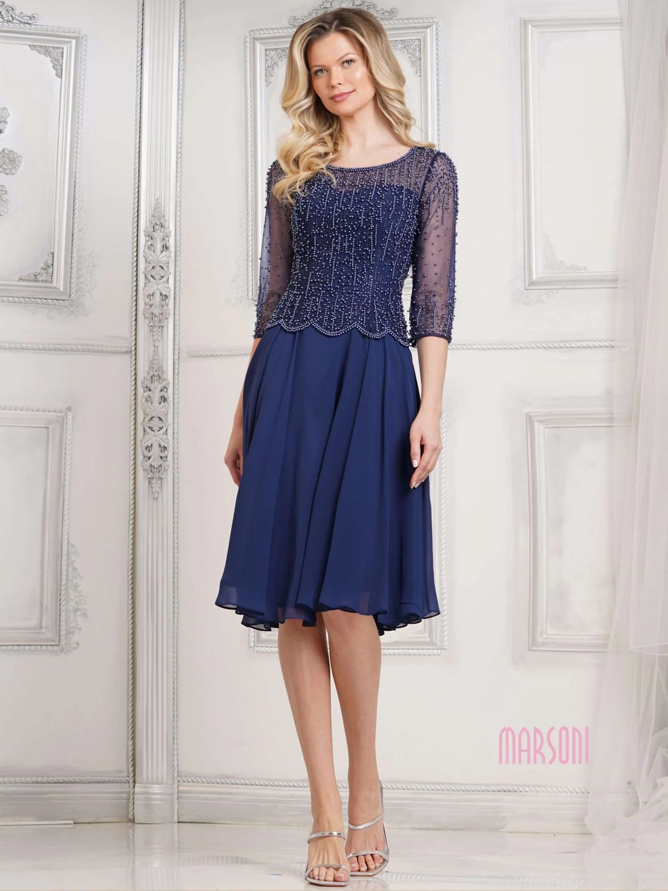 Slip into this playful M312S chiffon short dress. Show off your cheeky side with the bead & pearl embellished bodice and 3/4 sleeves. Perfect for any occasion, this dress is both refined and fun. (Is that a bead, or just a pearl of wisdom?)