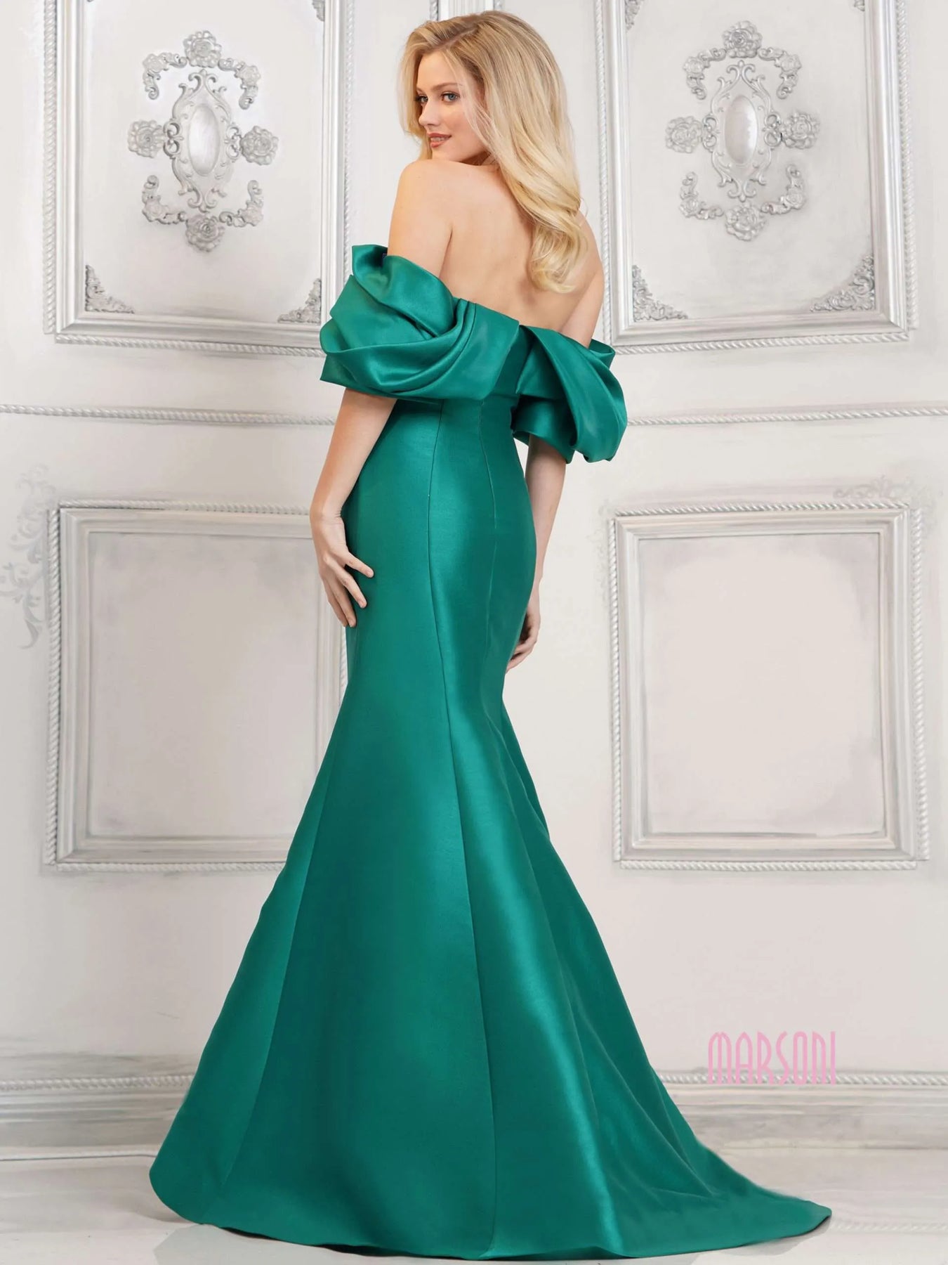 Be a showstopper in our MV1290 off shoulder fit & flare dupioni gown. The dramatic draped sleeve adds a touch of elegance while the horsehair hem gives volume to your look. Stand out from the crowd in this unique and stunning gown. (Pun intended).