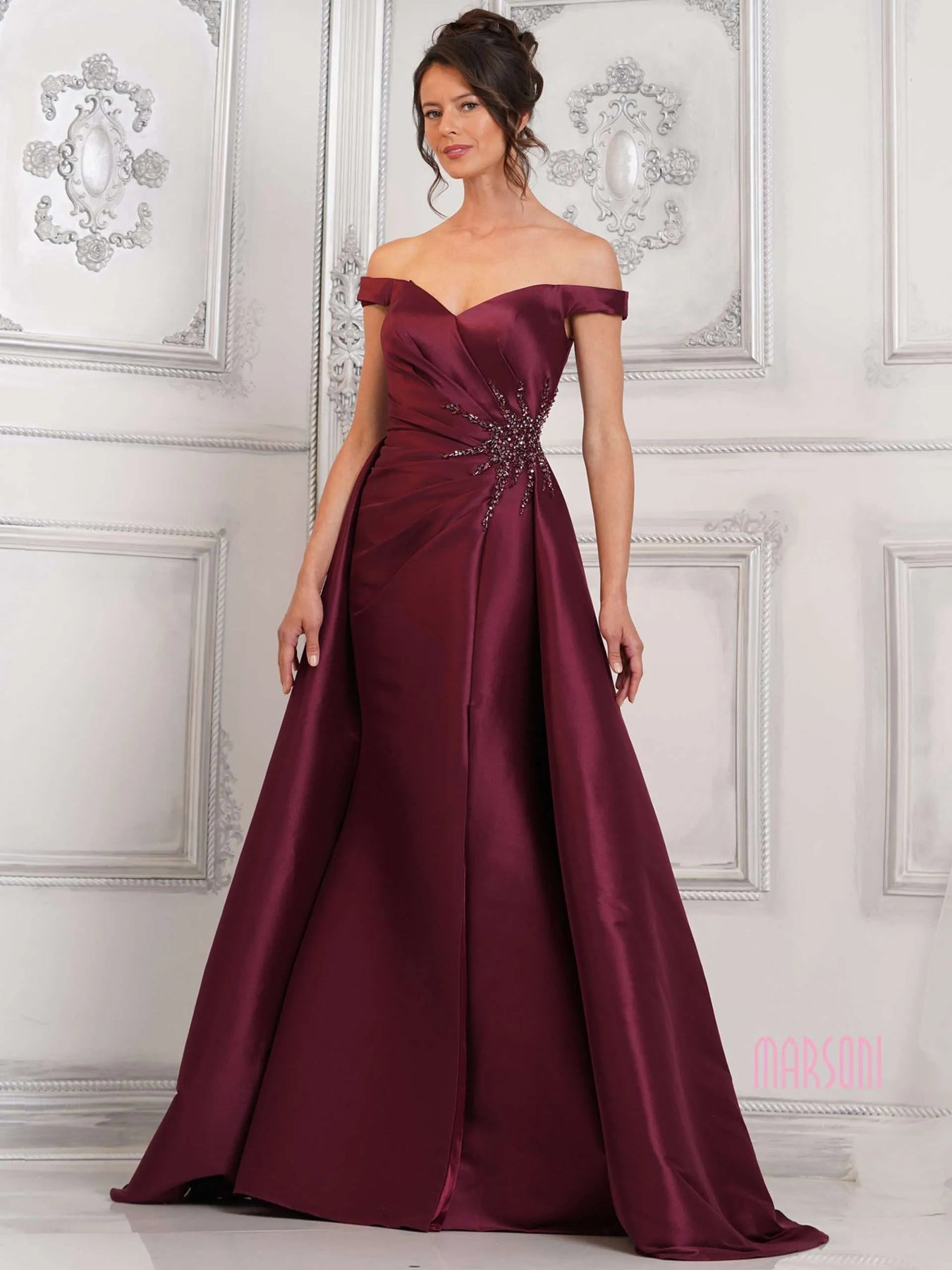 Unleash your inner fashionista with the MV1310 dress. Designed with an off shoulder stretch mikado statue dress, added with a set in over skirt and intricate bead applique, this dress will surely make you stand out in any event. The rouched bodice adds a touch of elegance and comfort. You'll be the talk of the town in this unique and beautiful piece.