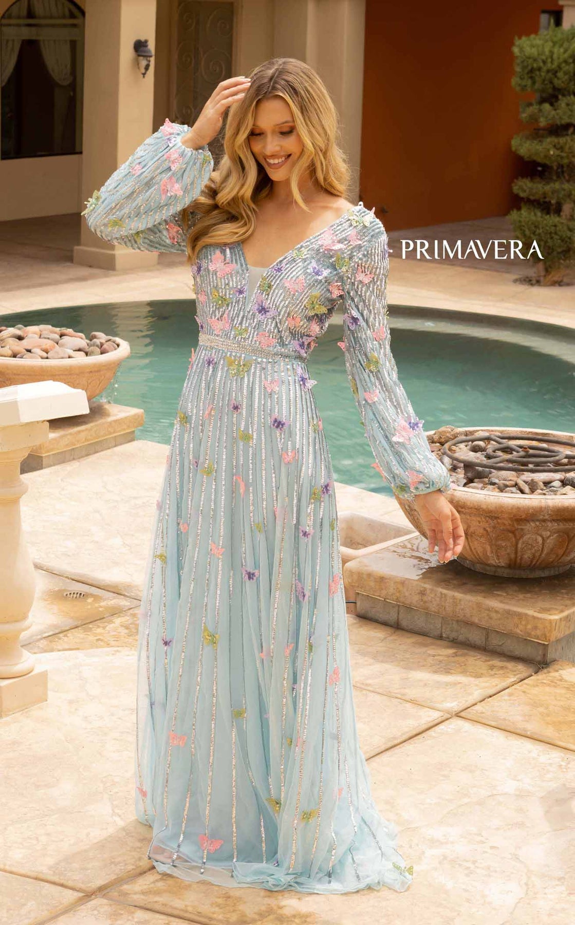تألقي بإطلالة أنيقة مع هذا الفستان الجذاب بقصة A من بريمافيرا كوتور 12024. يتميز بفتحة رقبة على شكل حرف V. يُضفي الحزام المُرصّع بالخرز لمسةً لامعةً على الصدر المُحكم. تُكمل الأكمام الطويلة المنتفخة والخصر الطبيعي أناقة التنورة الطويلة. الفستان مُزينٌ بفراشات ثلاثية الأبعاد ونقوش عمودية مُرصّعة بالترتر.