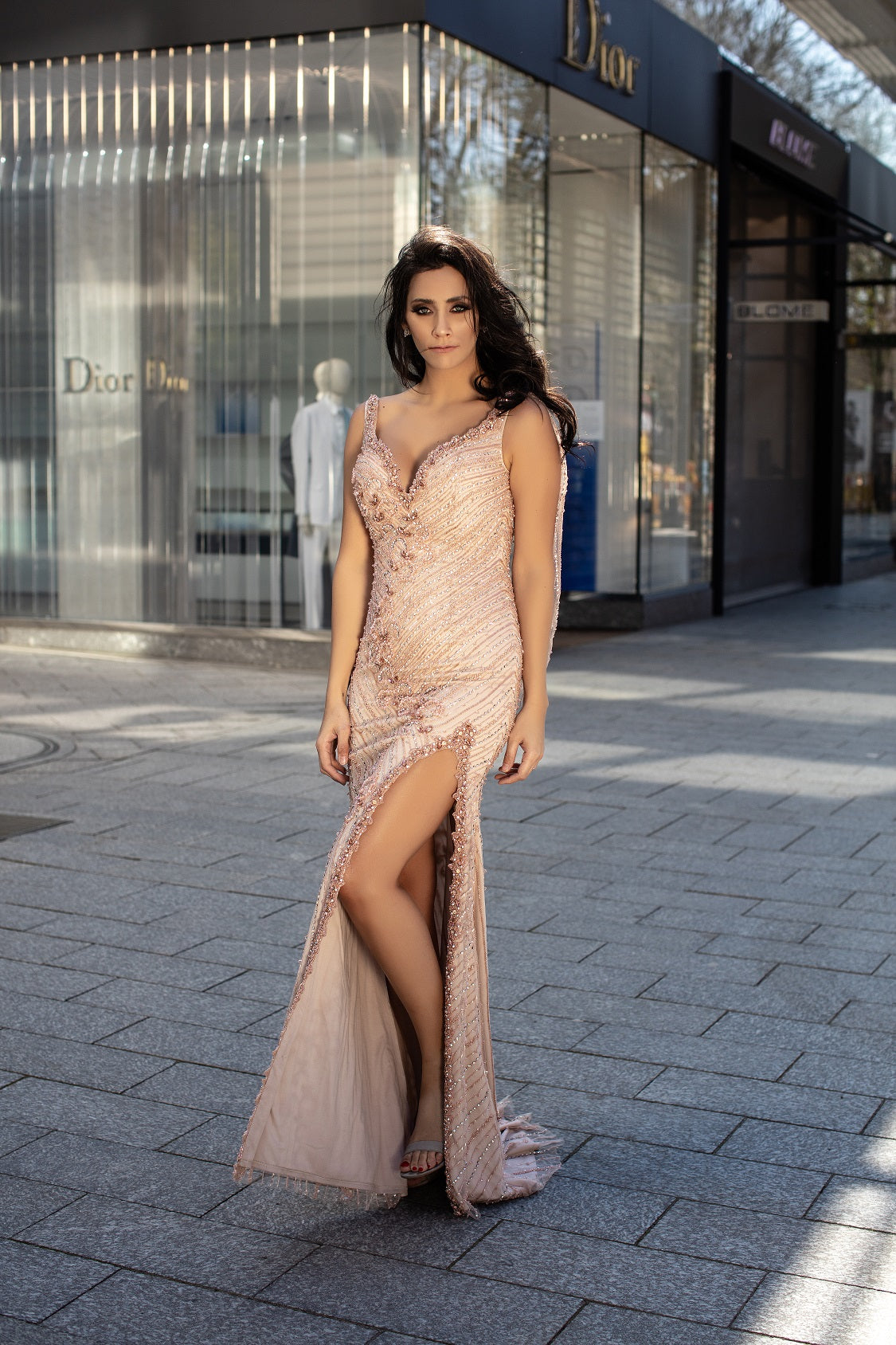تألقي بجمالٍ ساحر مع فستان HF1422 من شيك آند هولاند. يتميز هذا الفستان المزخرف بخرز كريستالي وزجاجي، وياقة على شكل قلب بدون أكمام، وظهر منسدل على شكل كابيليت. تصميمه الملائم، وفتحته التي تصل إلى الفخذ، وذيل الفستان الخفيف يُبرز منحنيات جسمك. استعدي لإبهار الجميع بهذا الفستان المذهل.