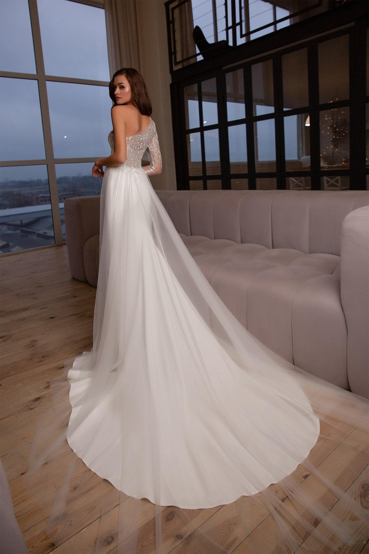 The Maria Anette 5102 Dress makes a daring statement with its elegant on-shoulder neckline and shimmering beading that captivates from every angle. The long-length skirt flows gracefully, featuring a dramatic train originating from the back of the hip, adding movement and bold sophistication. Ideal for the bride ready to command attention with a powerful, unforgettable presence.