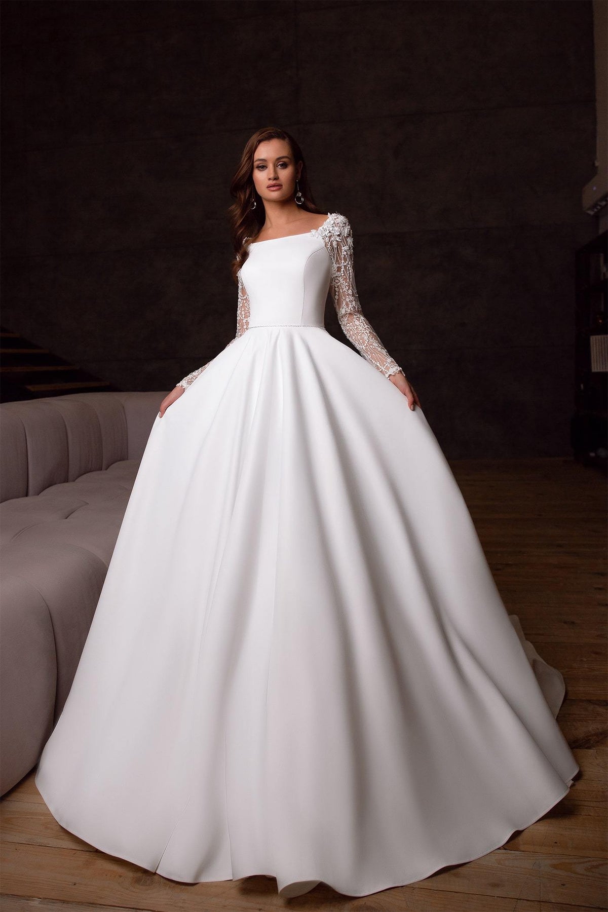 The Maria Anette 5105 Dress is a bold statement of bridal elegance with a striking square neckline and long sheer sleeves that showcase delicate lace appliqués. This full ballgown silhouette commands presence with its voluminous, long-length skirt, designed to turn heads and make an unforgettable entrance. Perfect for the bride who isn't afraid to embrace classic romance with a daring edge.