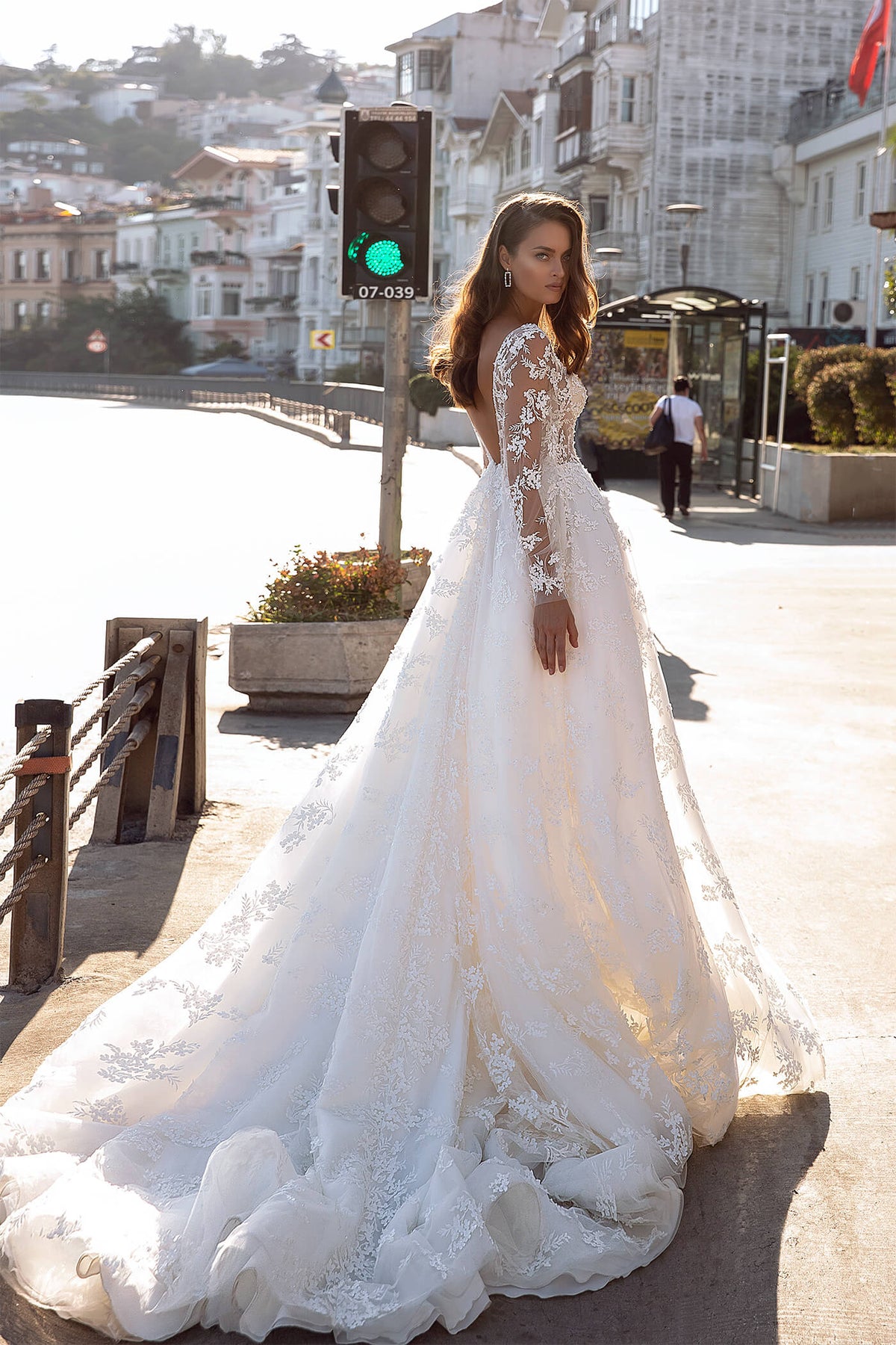The Maria Anette 5201 Dress boldly combines romance and edge with its plunging V neckline and dramatic long sheer puff sleeves adorned with 3D floral appliqués. A daring high slit cuts through the long-length skirt, adding movement and a touch of seduction to this bridal statement piece. Perfect for the bride who embraces fearless elegance.