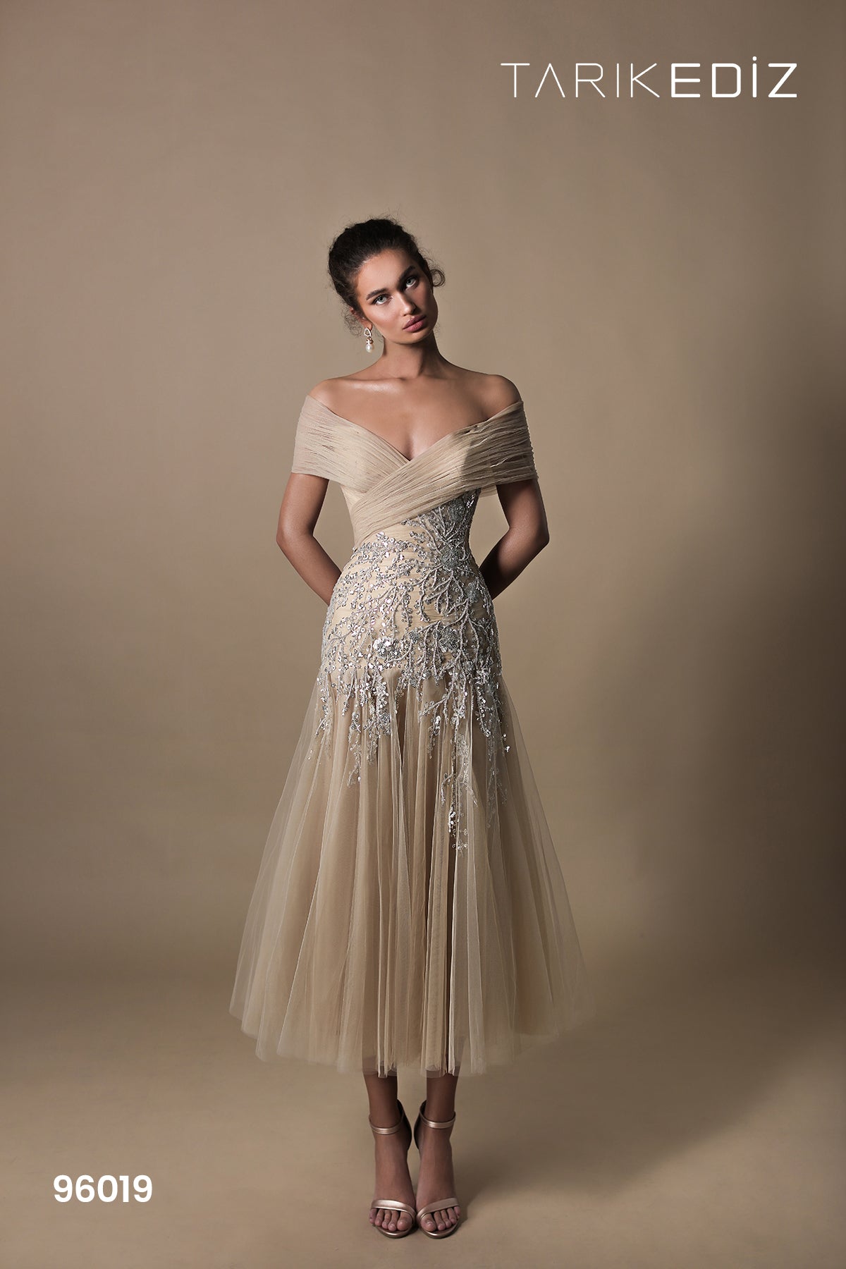 هذا الفستان من تصميم طارق إيديز، يتميز بفتحة رقبة على شكل حرف V وظهر على شكل حرف V، بالإضافة إلى أكتاف مكشوفة لإطلالة أنيقة. يضفي نسيج التول المطوي لمسة من الأناقة، بينما يُضفي الخرز في منتصف الفستان لمسة من التألق. مثالي لأي سهرة أو حفل كوكتيل.