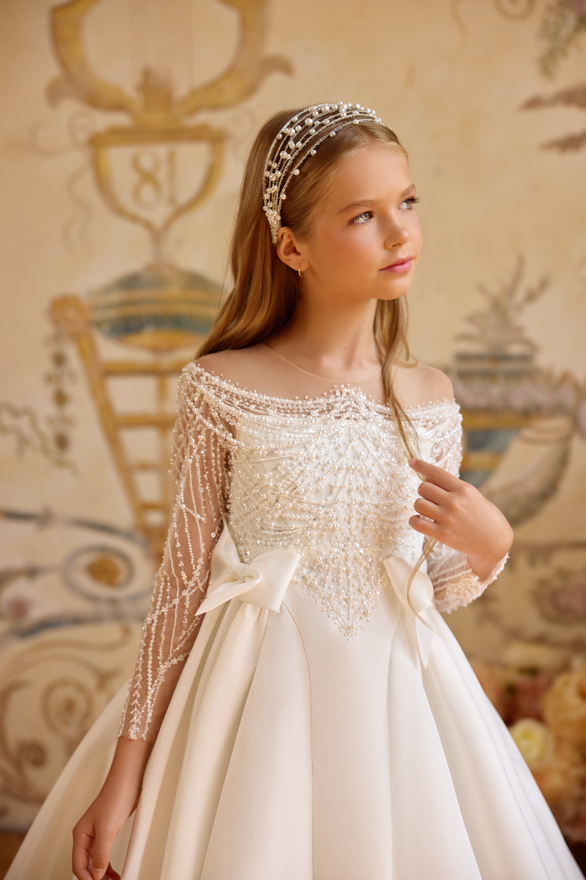The PENTELEI 3823 Dress is a daring kids’ dress featuring a strapless neckline layered with a sheer illusion overlay, beautifully enhanced by elegant beading. Two medium side bows at the waist add a playful yet bold touch, creating a striking look that’s perfect for special occasions.