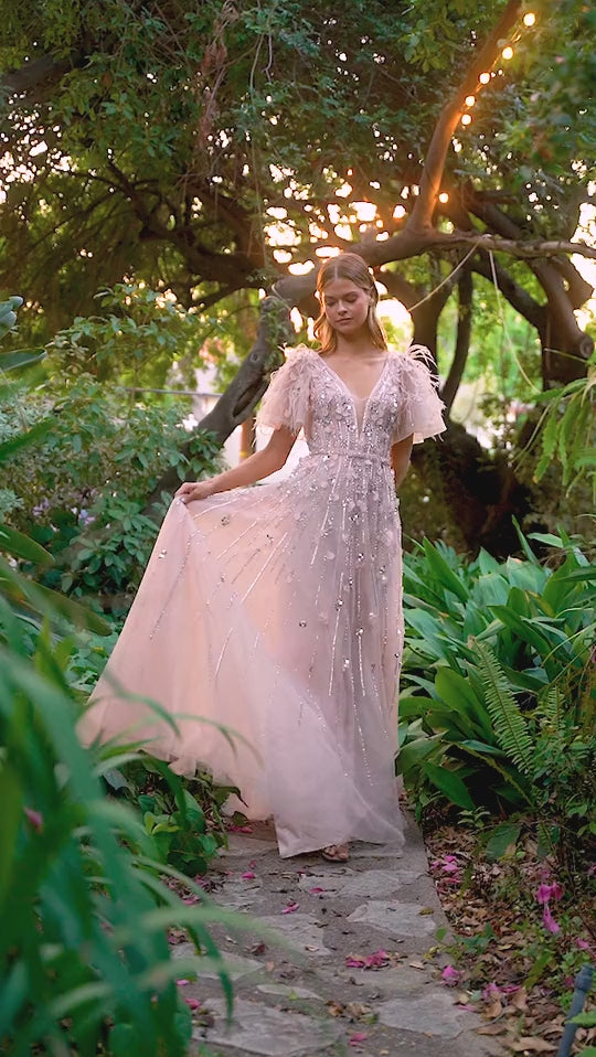استمتعي بقصة خيالية خاصة بكِ مع فستان أندريا وليو A1176. يتميز هذا الفستان الرائع بتصميم بتلات الزهور، بتصميم كلاسيكي على شكل حرف A، مصنوع من طبقات من التول، مزين بتطريزات خرزية رائعة وبتلات لإضفاء لمسة أنثوية رقيقة. تضفي الأكمام الواسعة المزينة بالريش لمسة فاخرة، بينما يضفي خط العنق المنخفض والظهر المفتوح لمسة من الجاذبية. مثالي لحفلات الزفاف والمناسبات الخاصة، أو لمجرد أنكِ تستحقين التألق!