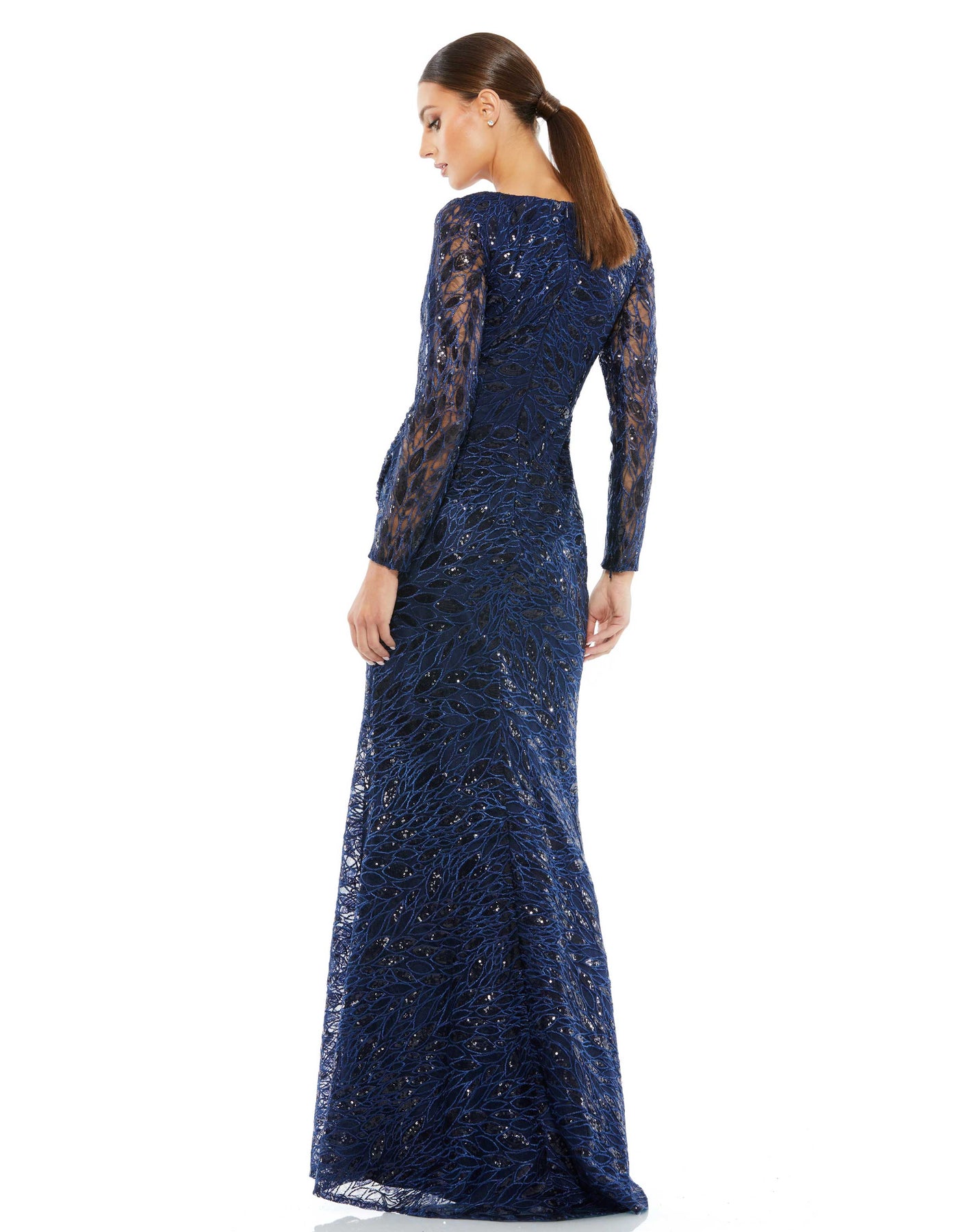 فستان سهرة مزين بالترتر بأكمام طويلة من الدانتيل مع إطراءٍ يخدش عند الخصر وفخذ عالي.