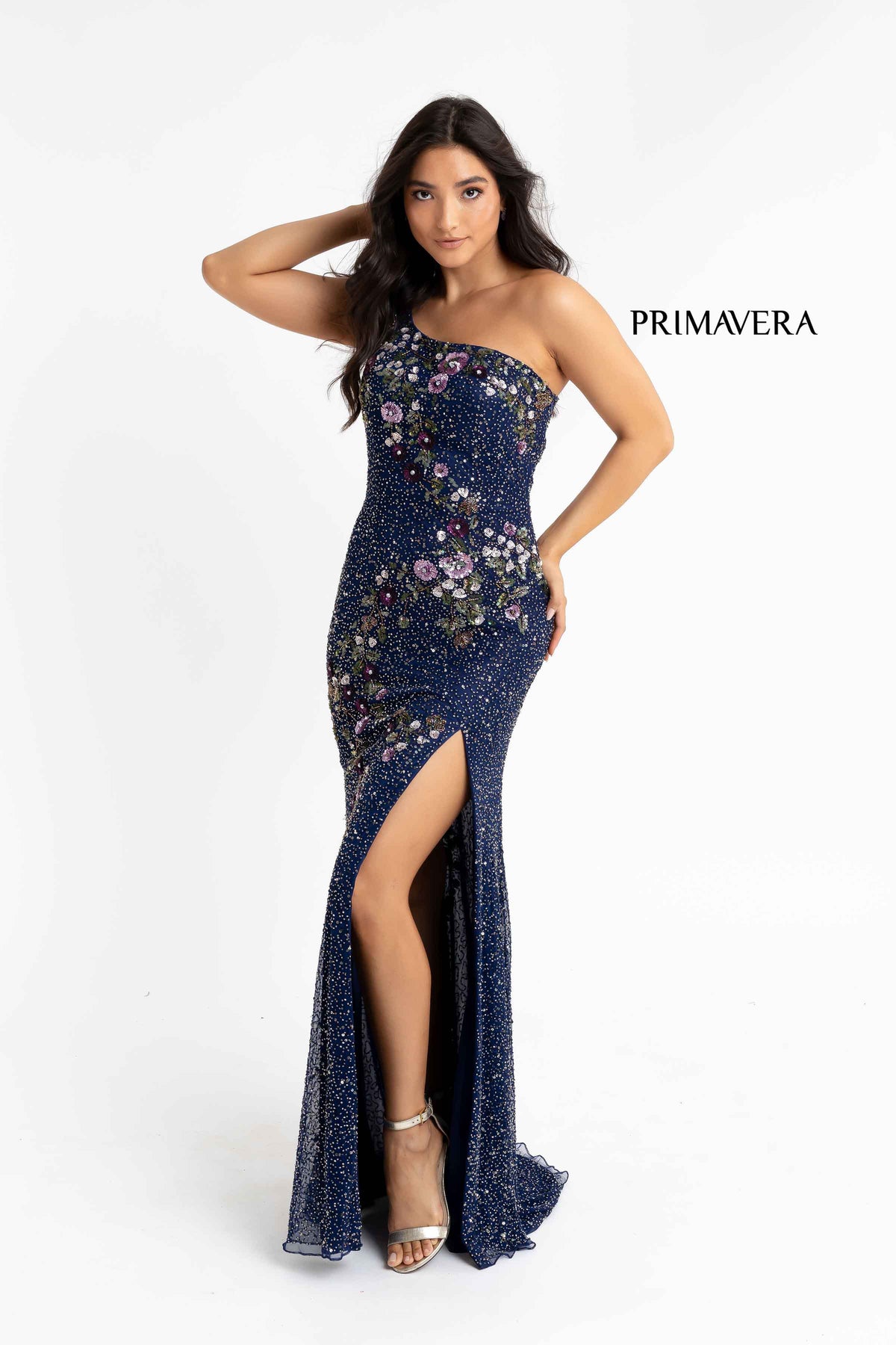 من المؤكد أن هذا الفستان من مجموعة Primavera Couture سيثير إعجابك بفضل شق جانبي جذاب وحبات الكريستال البراقة والترتر.