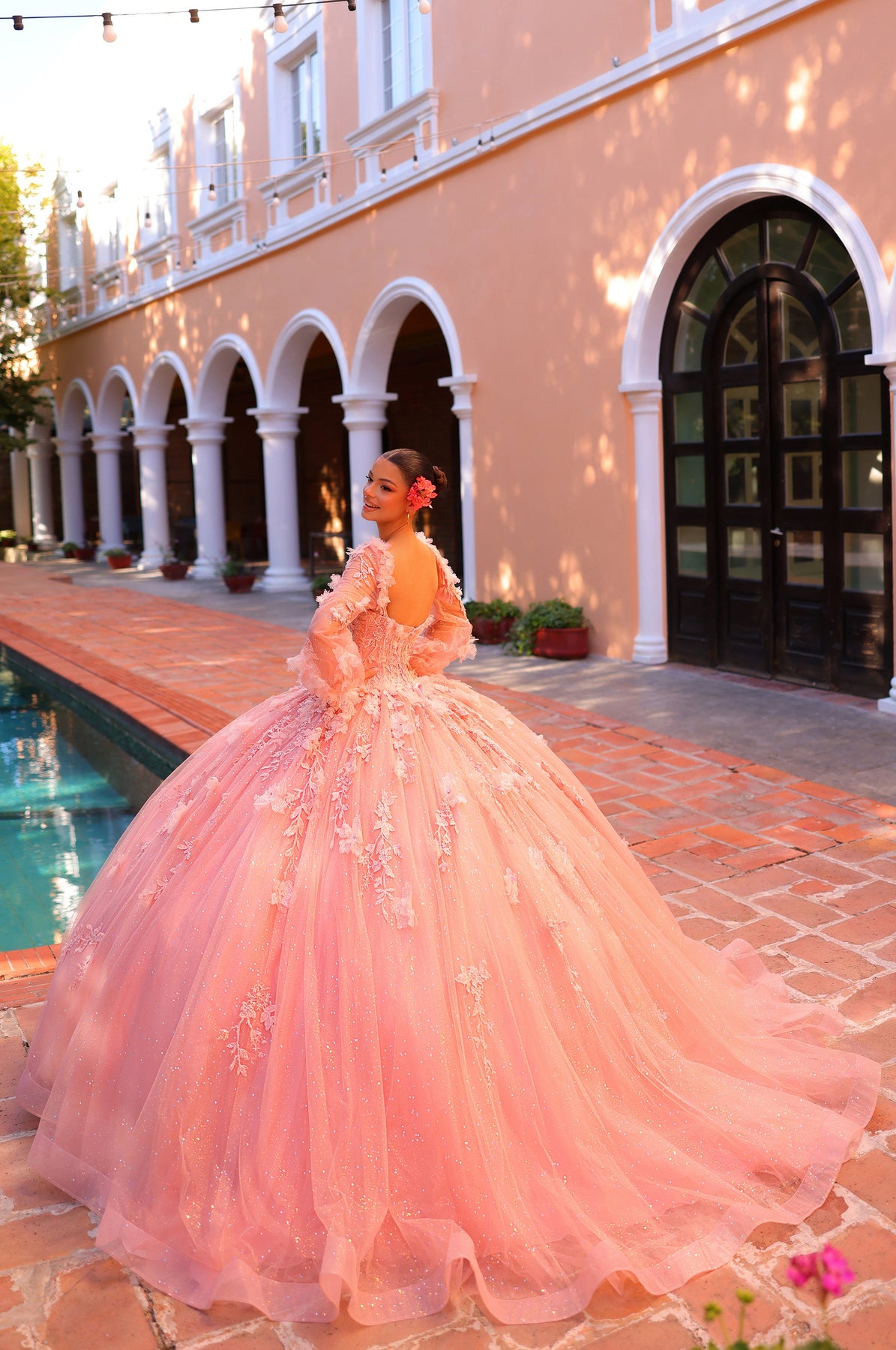 Step into a floral dream with the Amarra 54290 quinceañera gown, sparkling with embroidered lace and 3D flower accents. Its elegant bell sleeves and shimmering fabric catch the light beautifully, while the semi-sweetheart neckline adds a flirty touch. This dazzling dress is designed to make you the star of the night—get ready to turn heads and leave everyone breathless!