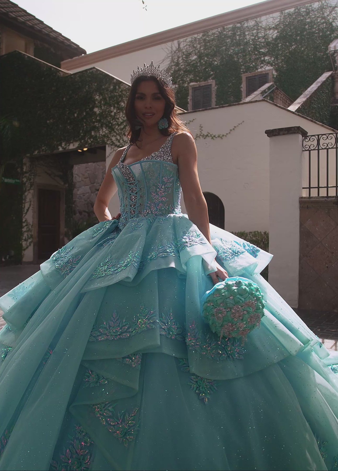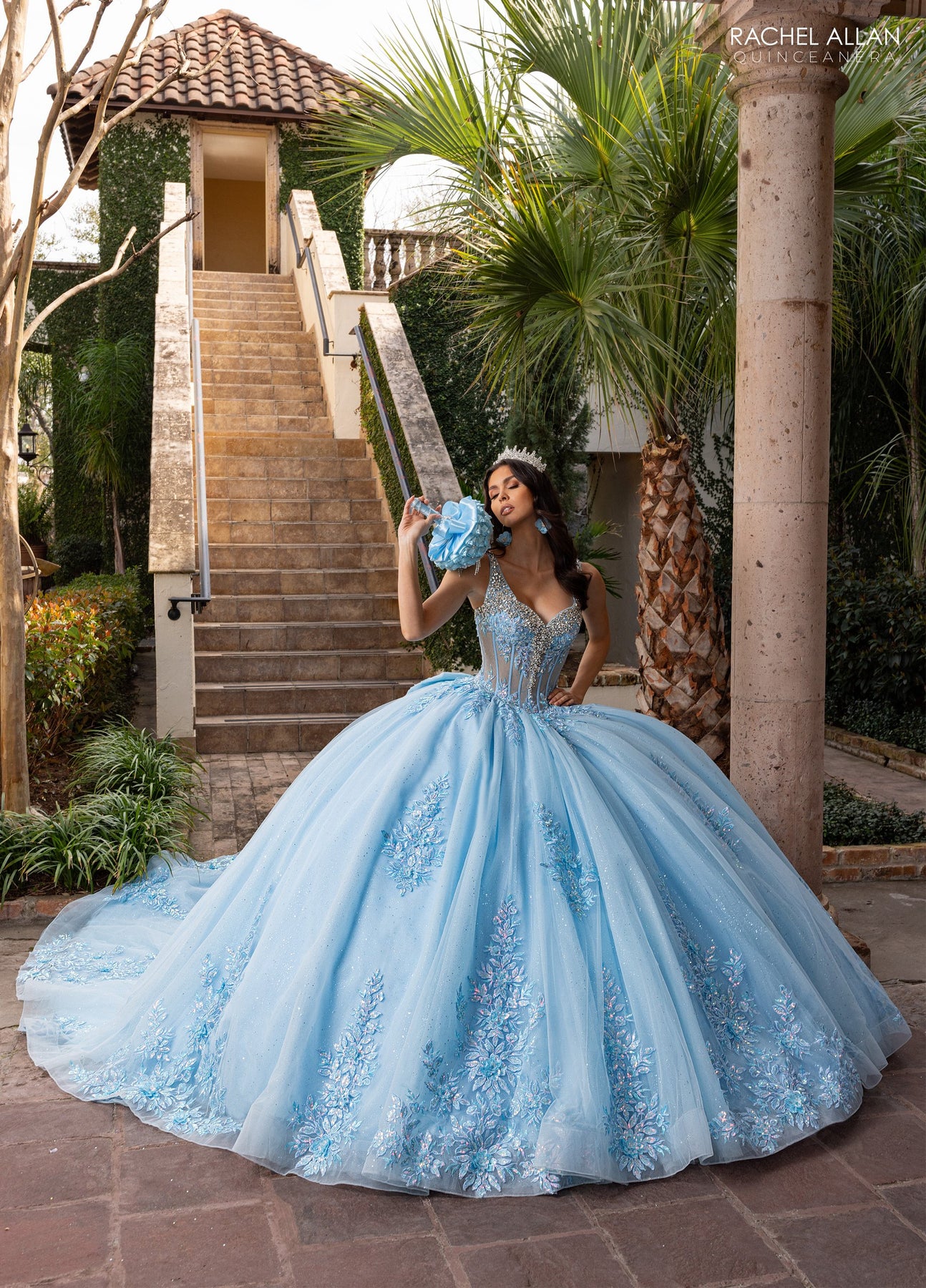 Step into the spotlight with the Rachel Allan RQ3158 Dress, available in enchanting Blush or soft Sky Blue. This glittering tulle gown dazzles with floral appliqués and sparkling beadwork, while a voluminous layered skirt adds flair to every twirl. With a detachable corset overlay and bow, it’s perfect for making grand entrances at quinceañeras or any celebration where elegance meets fun.