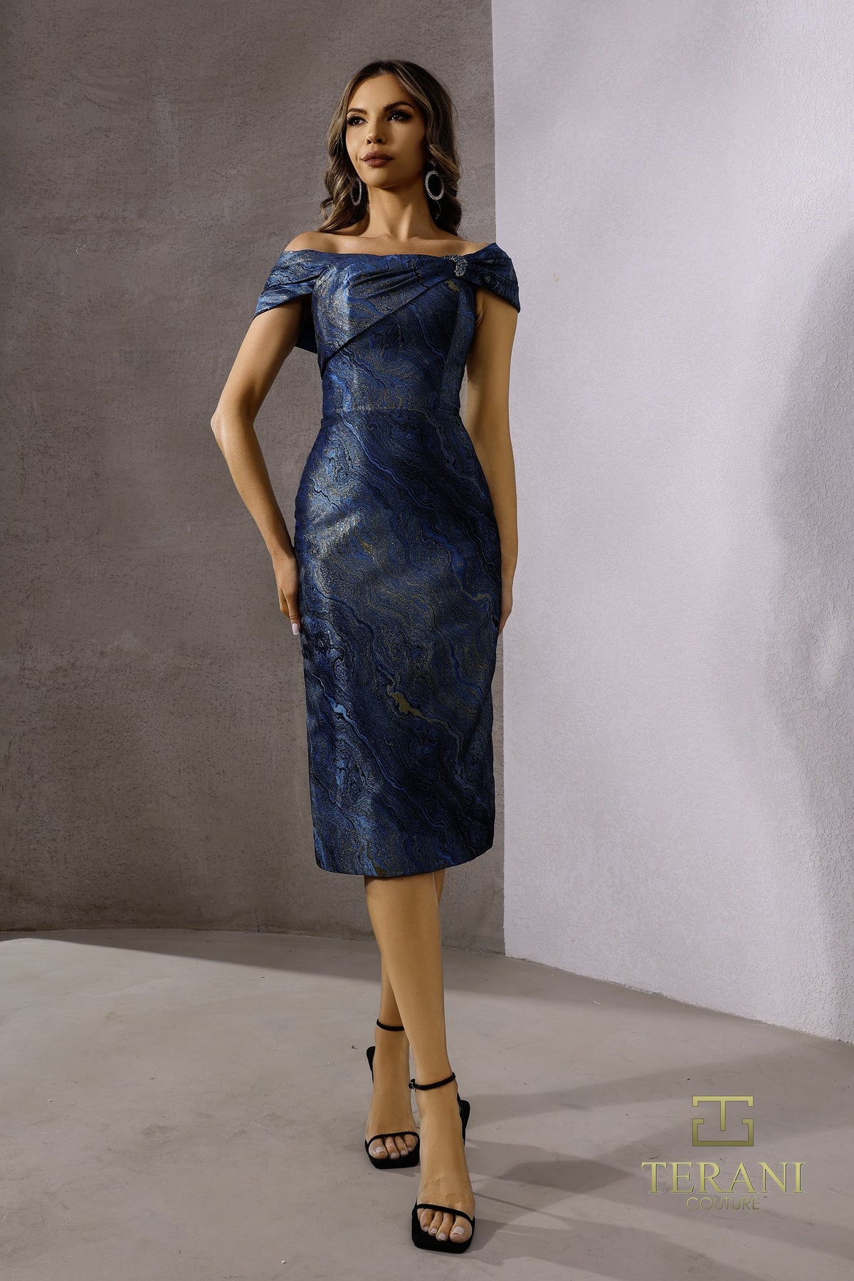 Step into the spotlight in the Terani Couture 252C5019, where glamour gets a playful twist! This knee-length cocktail dress flaunts a fitted silhouette that hugs you just right, while the strapless off-the-shoulder neckline keeps things flirty and fun. The marble jacquard fabric shimmers with a luxe blend of wine gold, hunter gold, and teal gold—talk about a show-stopping color combo! Subtle ruched detailing adds movement and texture, giving you that extra oomph of sophistication. With a discreet back zipper for an effortless fit, this is your go-to dress for turning heads and stealing the night.