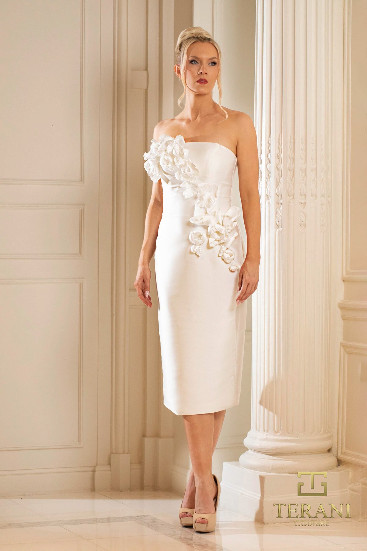 This Terani Couture 252C5042 dress features a flattering bodycon silhouette in navy, rose, and ivory mikado fabric. Its sleeveless design and straight neckline create an elegant look, while the back zipper and hook & eye closure ensure a secure, comfortable fit. Perfect for special occasions, this midi-length dress offers both style and sophistication.