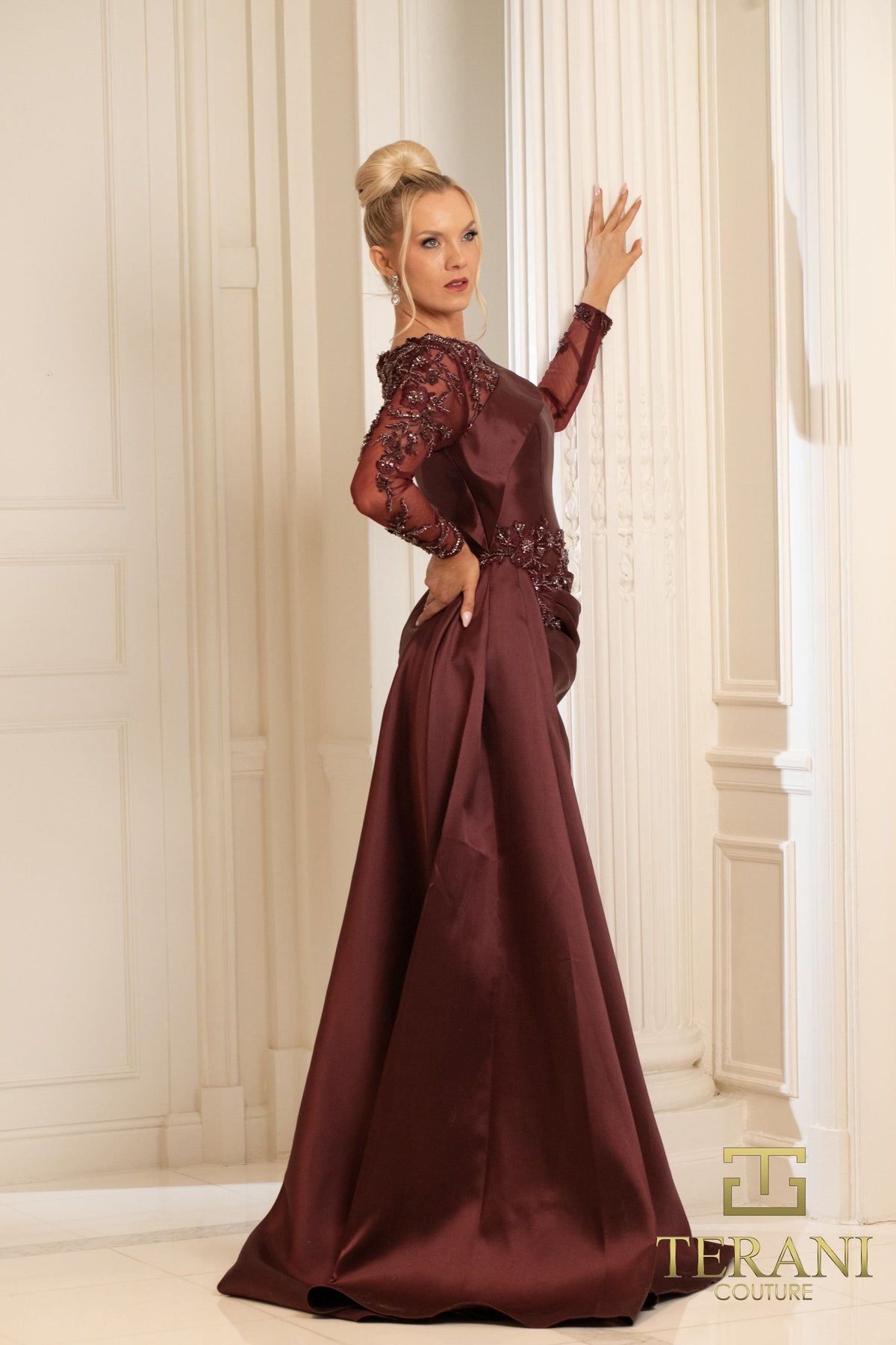 The Terani 252M5344 Dress combines sophistication with timeless elegance. It features an illusion neckline and a side train silhouette that contours the upper body before flowing into a floor-length skirt. Made from luxurious mikado fabric with a subtle sheen, the dress showcases intricate bead and sequin details along the floral embroidered bodice and waist. Sheer long sleeves embellished with delicate lace and beadwork add romantic, vintage allure. This refined gown balances structured design with soft pleats, making it an exquisite choice for formal occasions.