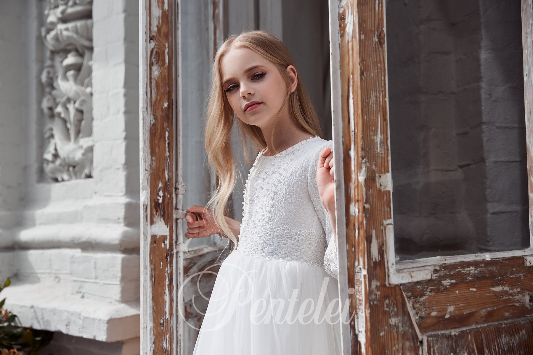 The PENTELEI 3135 Dress features three-quarter length lace sleeves with delicate scalloped trim for an elegant edge. Its full-length layered tulle skirt is accented by a horizontal lace panel above the hemline, finished with a gathered ruffle that adds bold texture. The covered back completes this daring design, perfect for making a refined yet striking statement.