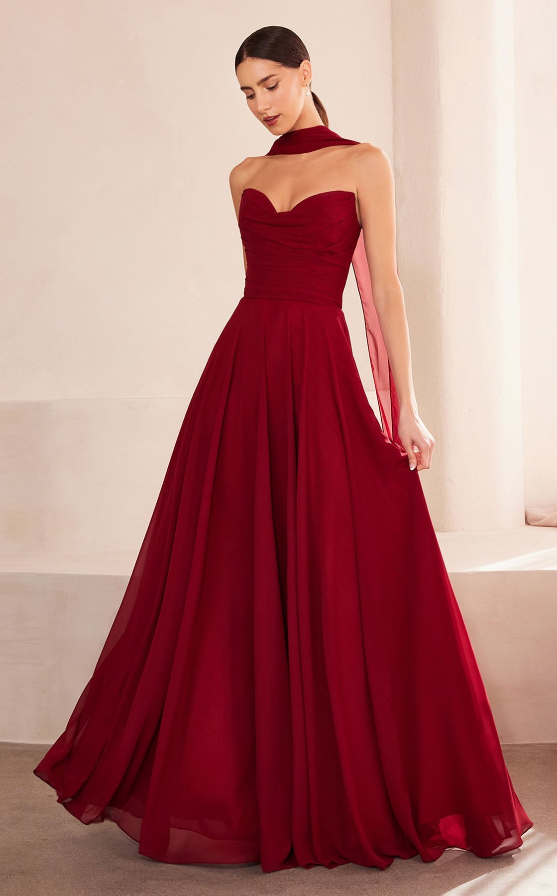This elegant A-line gown features a strapless sweetheart cowl neckline that drapes beautifully for a soft, romantic look. The fitted bodice with a lace-up corset back provides both structure and a customizable fit, while the flowing chiffon skirt moves gracefully with every step. Complete with a delicate scarf accessory, this gown is perfect for weddings, bridesmaids, or any formal event.