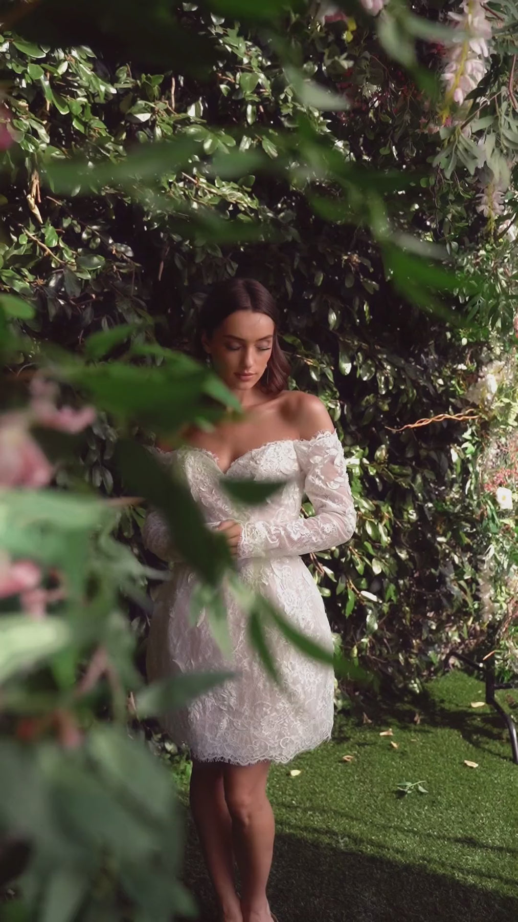 This soft A-line dress features a sweetheart off-the-shoulder neckline and long sleeves adorned with delicate Chantilly lace and a scalloped eyelash lace hem. The A-line silhouette offers a graceful and flattering fit, making it perfect for a wedding reception, engagement photoshoot, or rehearsal dinner. Embrace timeless elegance with this beautifully detailed dress, designed to make every special occasion unforgettable.