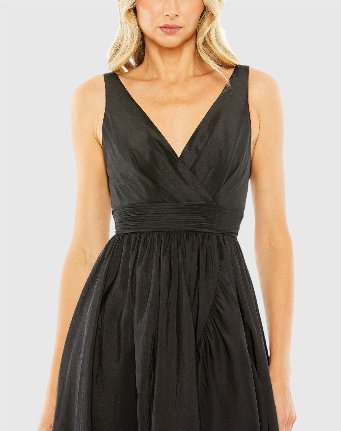 Striking hi-low taffeta gown with a pleated bodice, plunging v-neckline, and a dramatic ruffled hemline.