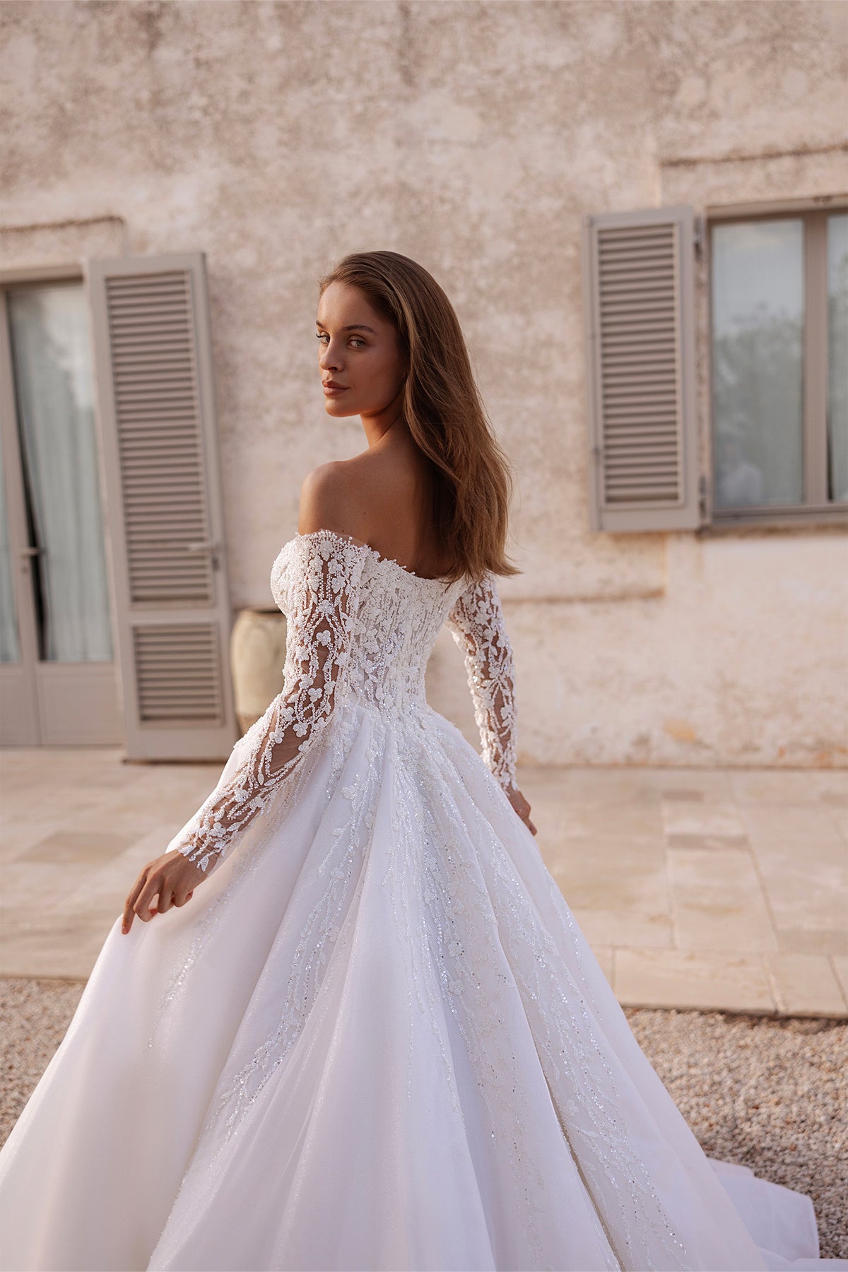Meet your fairy-tale moment with the Maria Anette 5823—a breathtaking ball gown that's pure magic. This romantic masterpiece combines an elegant sweetheart neckline with a flirty off-shoulder design, while the show-stopping open back adds just the right touch of modern allure. Crafted for brides who want to feel like royalty, the voluminous skirt creates that dreamy, princess-worthy silhouette. Graceful, glamorous, and absolutely unforgettable.