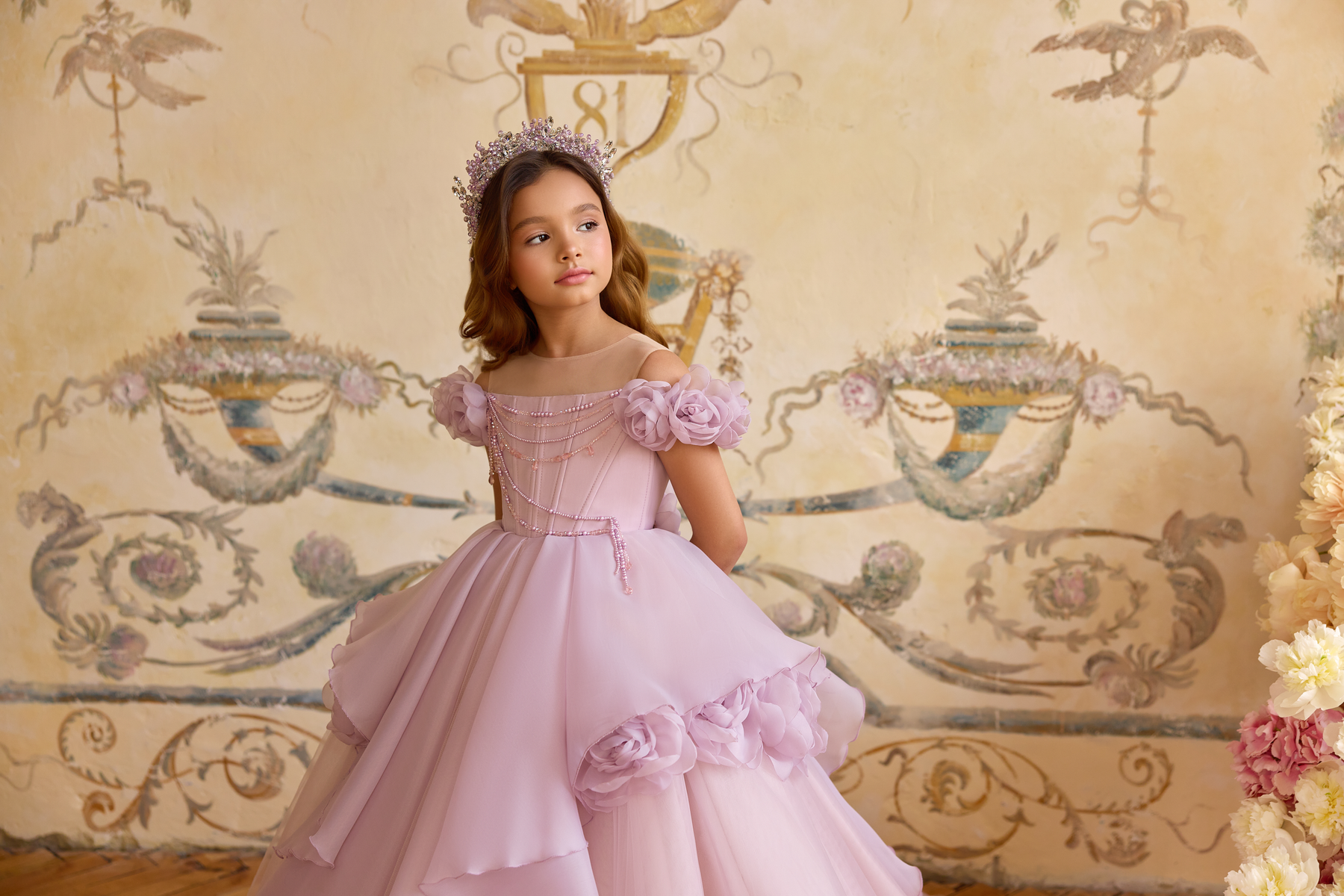 The PENTELEI 3812 Dress is a daring long-length gown featuring an off-shoulder neckline with straps beautifully adorned with delicate 3D roses, adding a vibrant touch of elegance. Its ruffled skirt boosts movement and volume, creating a bold and unforgettable look that’s perfect for standing out at any special occasion.
