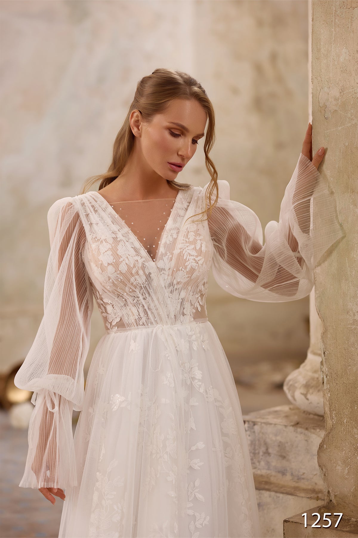 Embrace timeless elegance with the Vissaria 1257 Dress, a stunning long gown designed for the modern bride. This sophisticated piece features a flattering V-neckline that frames the face beautifully, while full-length sleeves provide graceful coverage and a refined silhouette. The flowing maxi length creates an ethereal, romantic aesthetic perfect for your special day. Whether you're walking down the aisle or celebrating at your reception, this dress combines classic bridal beauty with contemporary style, ensuring you feel confident and radiant throughout your celebration.