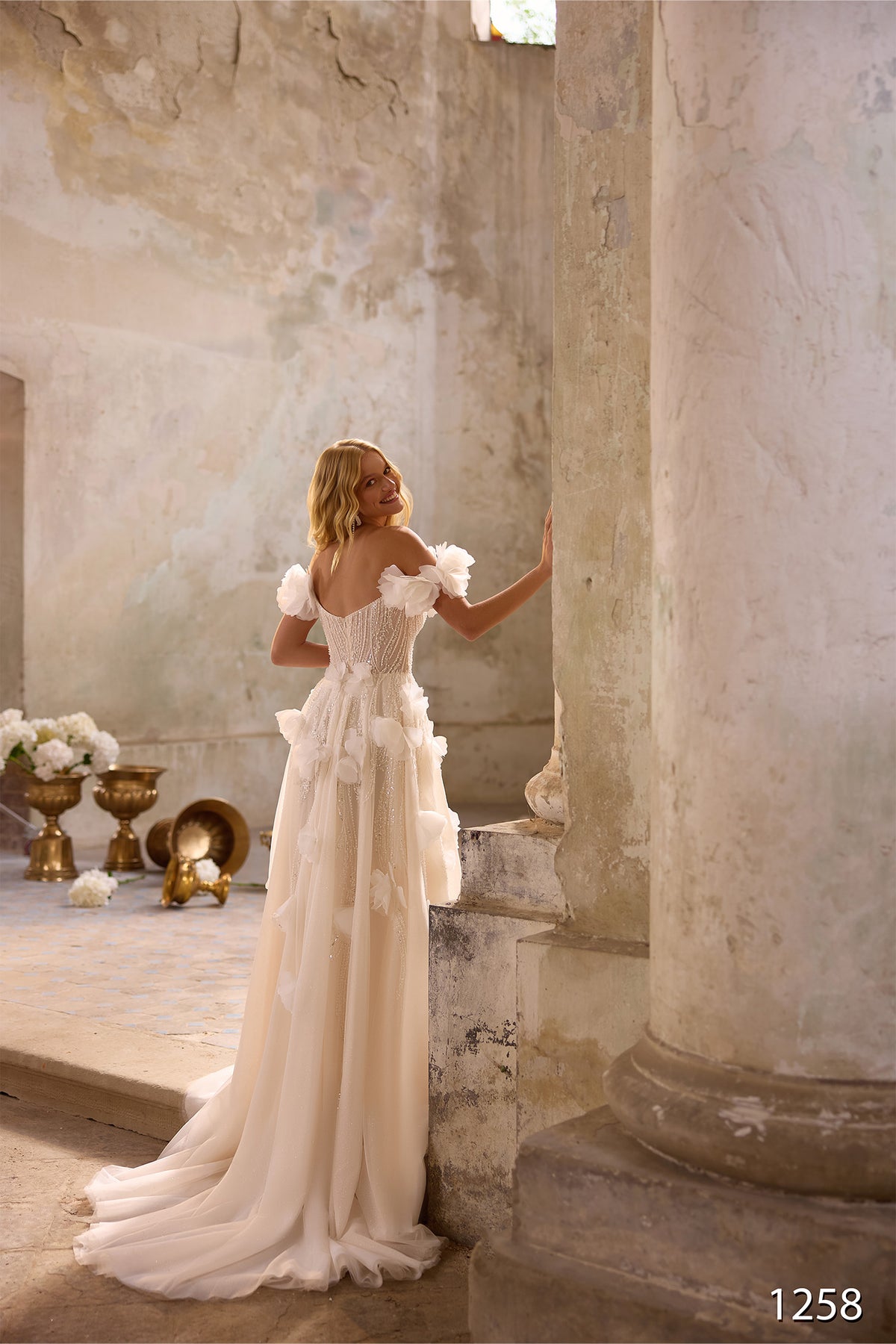 Embrace your special day in this stunning Vissaria 1258 long dress, designed to make you feel radiant and cherished. The elegant off-shoulder neckline frames your face beautifully while the romantic flowery design adds timeless grace. Delicate beading throughout catches the light with every movement, creating a magical shimmer that celebrates your beauty. Perfect for brides seeking a dress that combines sophistication with enchanting details, this gown wraps you in elegance from the moment you slip it on. Let this dress be your companion as you walk toward your happiest moments.