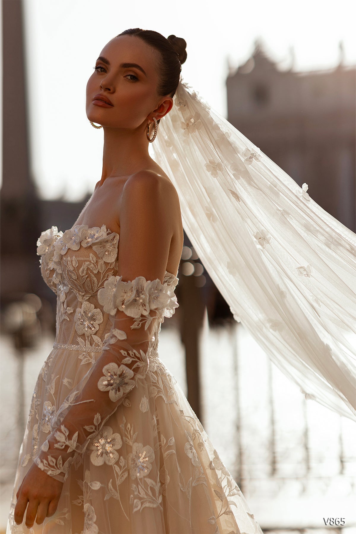 The Vissaria 865 Dress is a stunning bridal choice that combines timeless elegance with modern sophistication. This long dress features an off-shoulder neckline and flowing long sleeves that create a romantic, graceful silhouette. The open back design adds an unexpected touch of allure while maintaining the refined aesthetic every bride deserves. Perfect for those seeking a dress that balances classic bridal beauty with contemporary style, this gown celebrates your special day with understated glamour and confidence.