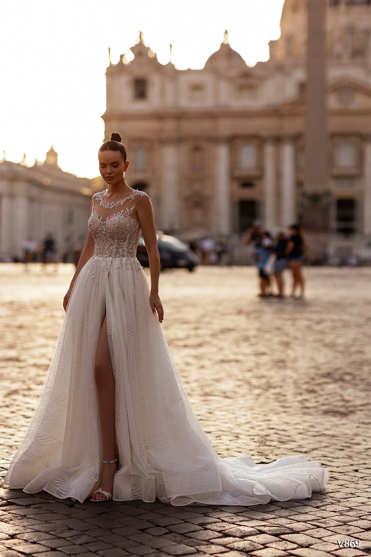 Make your wedding day unforgettable in the Vissaria 869 Dress, a breathtaking sleeveless gown crafted for the radiant bride. This elegant long dress showcases a romantic sweetheart neckline and a daring high slit that balances classic charm with modern allure. The flowing fabric drapes beautifully, creating a silhouette that celebrates your femininity and grace. Every detail is designed to make you feel confident and cherished as you walk toward your happily ever after. A dress as extraordinary as your love story.