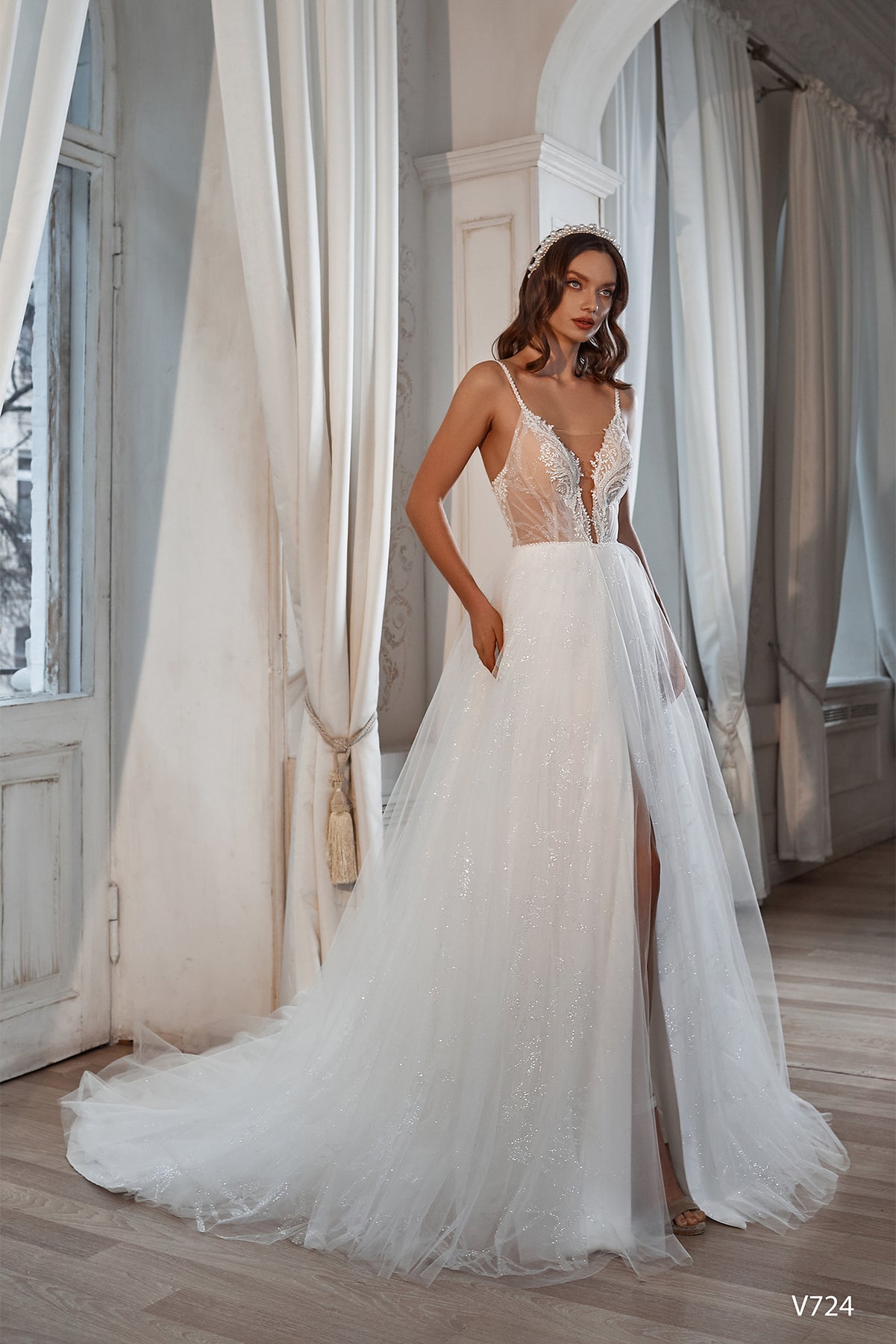 Embrace your most romantic vision with the Vissaria v724, a breathtaking tulle gown designed for the bride who dreams in elegance. This ethereal dress features a flattering V-neckline and graceful sleeveless silhouette that celebrates your shoulders and collarbone. The showstopping open back creates an unforgettable moment as you walk down the aisle, offering both sophistication and allure. Crafted from luxurious tulle, this gown flows beautifully with every step, creating an enchanting silhouette that photographs beautifully. Perfect for the modern bride seeking a balance of timeless romance and contemporary style, this dress promises to make your special day truly unforgettable.